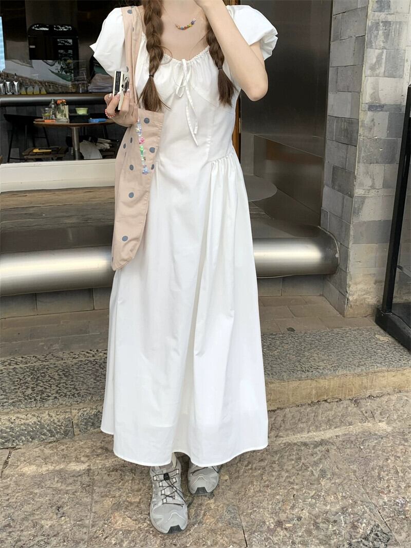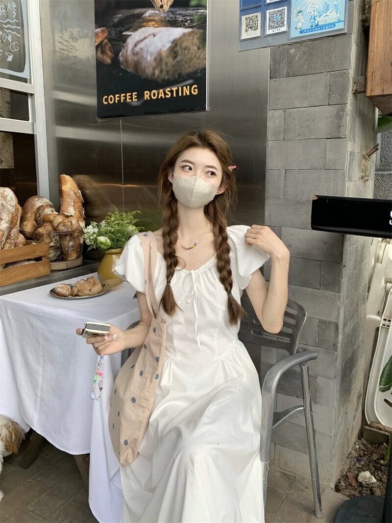ホワイトドレスレディース2023夏新作優しい風パフスリーブVネックウエスト痩身ミドル丈Aラインスカート サマー 夏物 missk27154685829