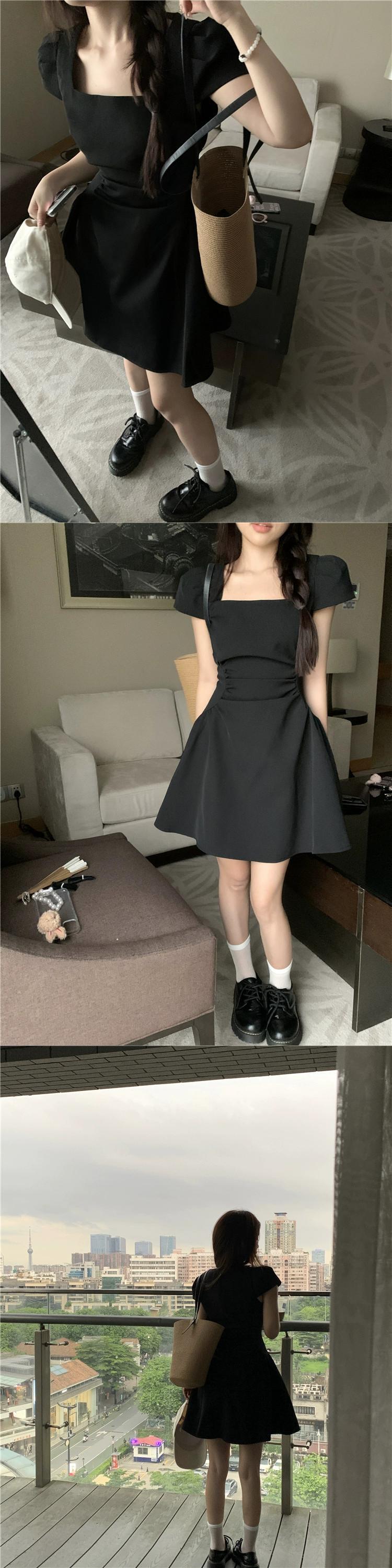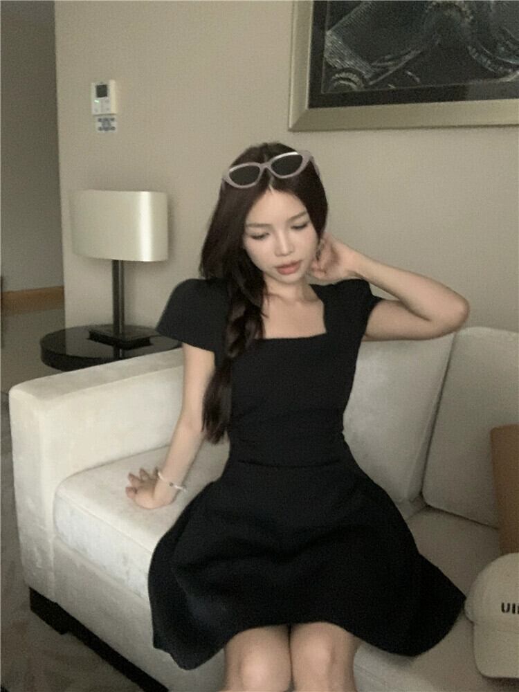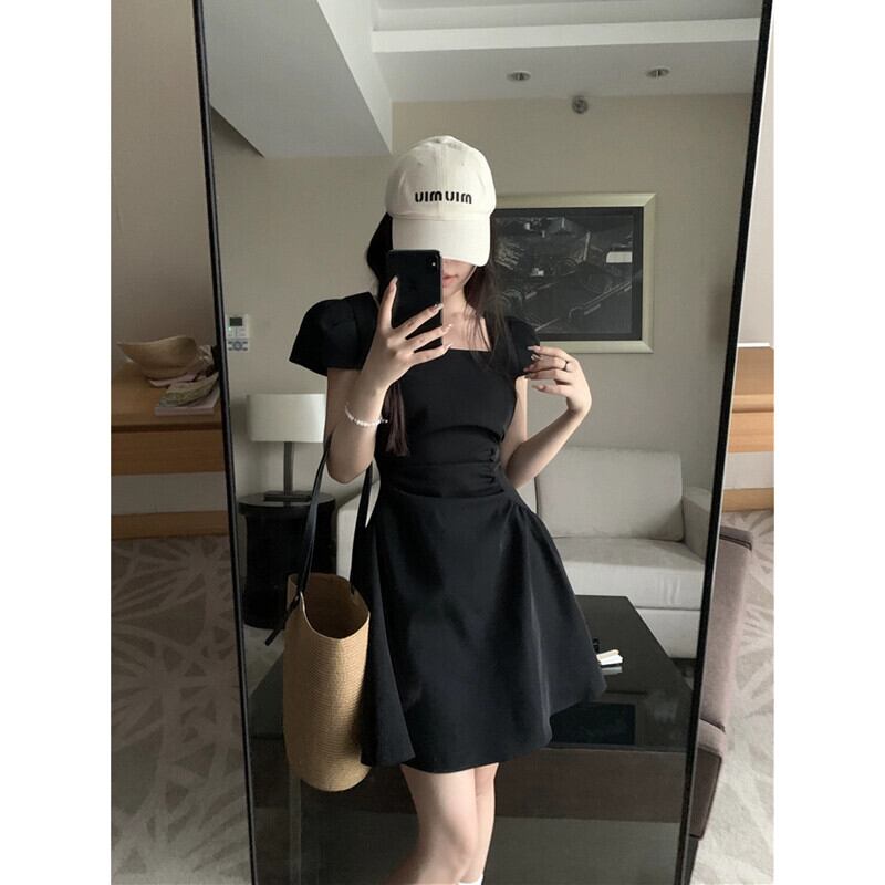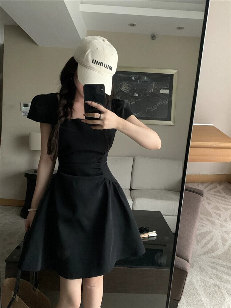 デートドレス女性の夏 2023 新しいヘップバーンスタイルウエスト痩身スクエアカラーデザイン半袖小さな黒のスカート ブラック サマー 夏物 スクウェア missk67209280337