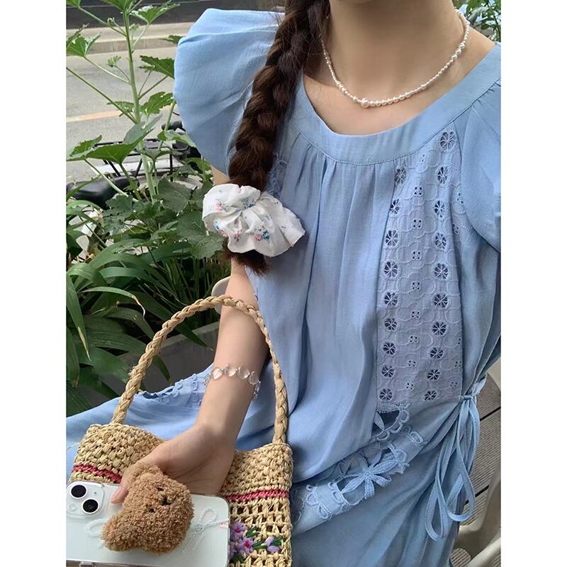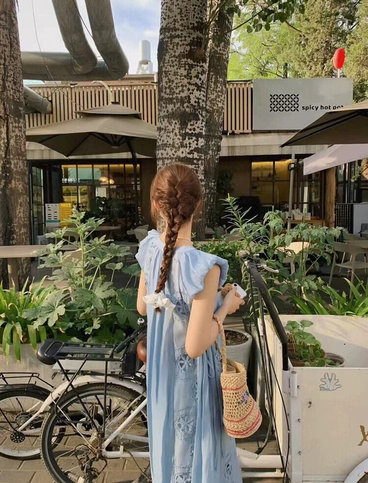 ドーパミンはテンセル刺繍ドレスの女性の夏の新しい高級感のあるウエストと小さな飛行袖の青いロングスカートを着ています ブルー サマー 夏物 missk95275868723