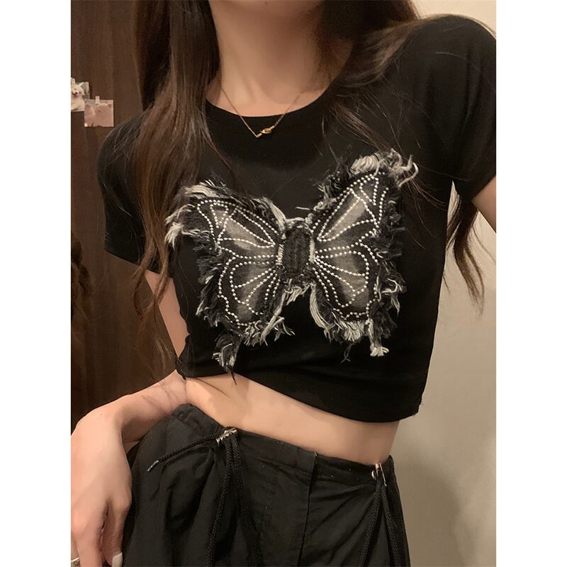 Hot Girl 半袖 Tシャツ レディース 夏 2023 レトロ バタフライ パッチ スリム スリム ショート トップ サマー 夏物 missk57440935509