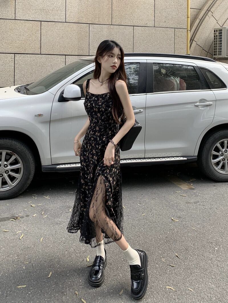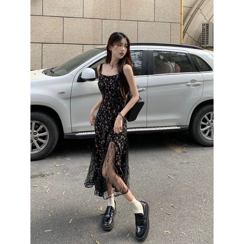 ヘップバーンスタイルの花柄スリングドレスの女性の夏の 2023 新しいメッシュスプライシングデザインセンスウエスト痩身スカート サマー 夏物 missk13860836079