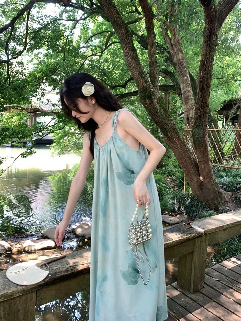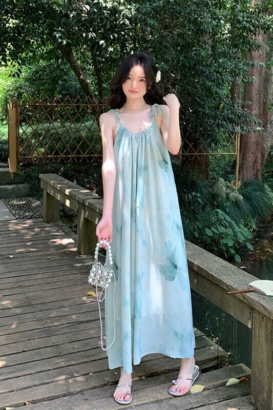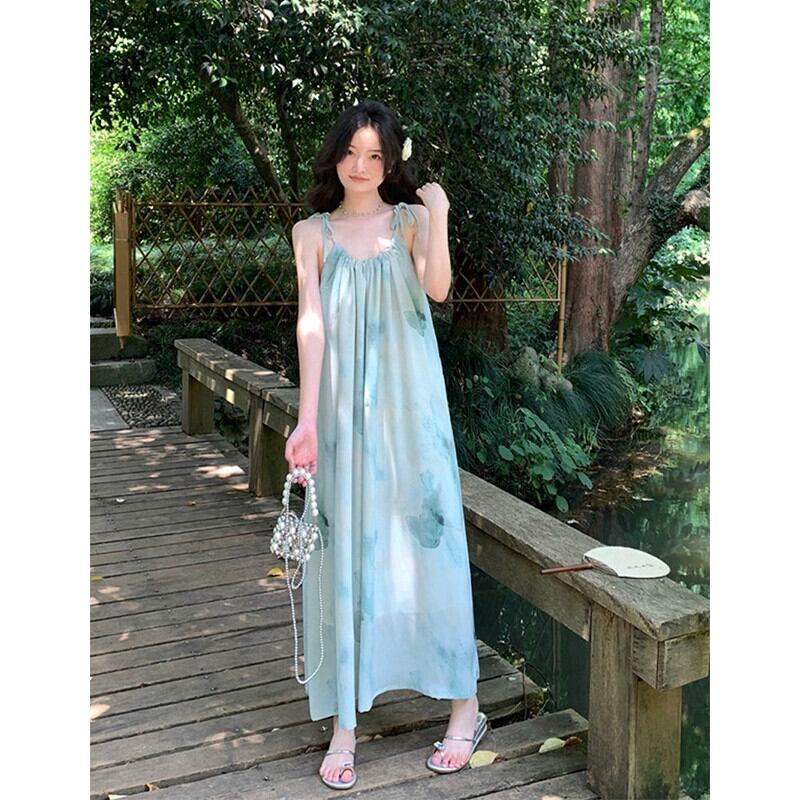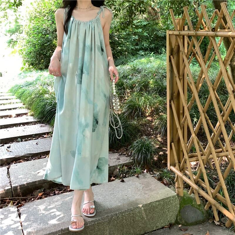 レトロインク絞り染めサスペンダードレス女性の夏 2023 新しいホリデースタイルルーズ腹カバー膝丈スカート サマー 夏物 missk2644013873