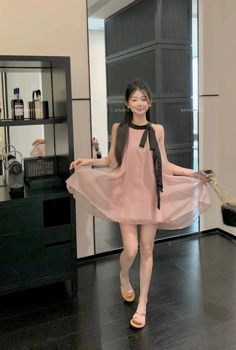 色:ピンクと黒のストラップ付きホルターネックドレス