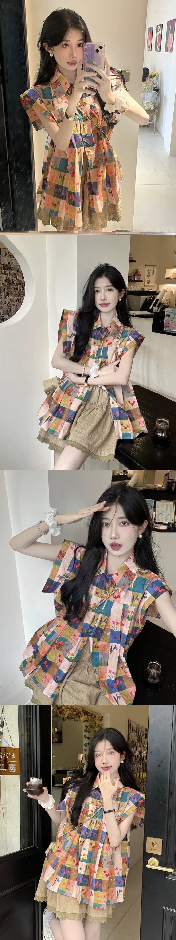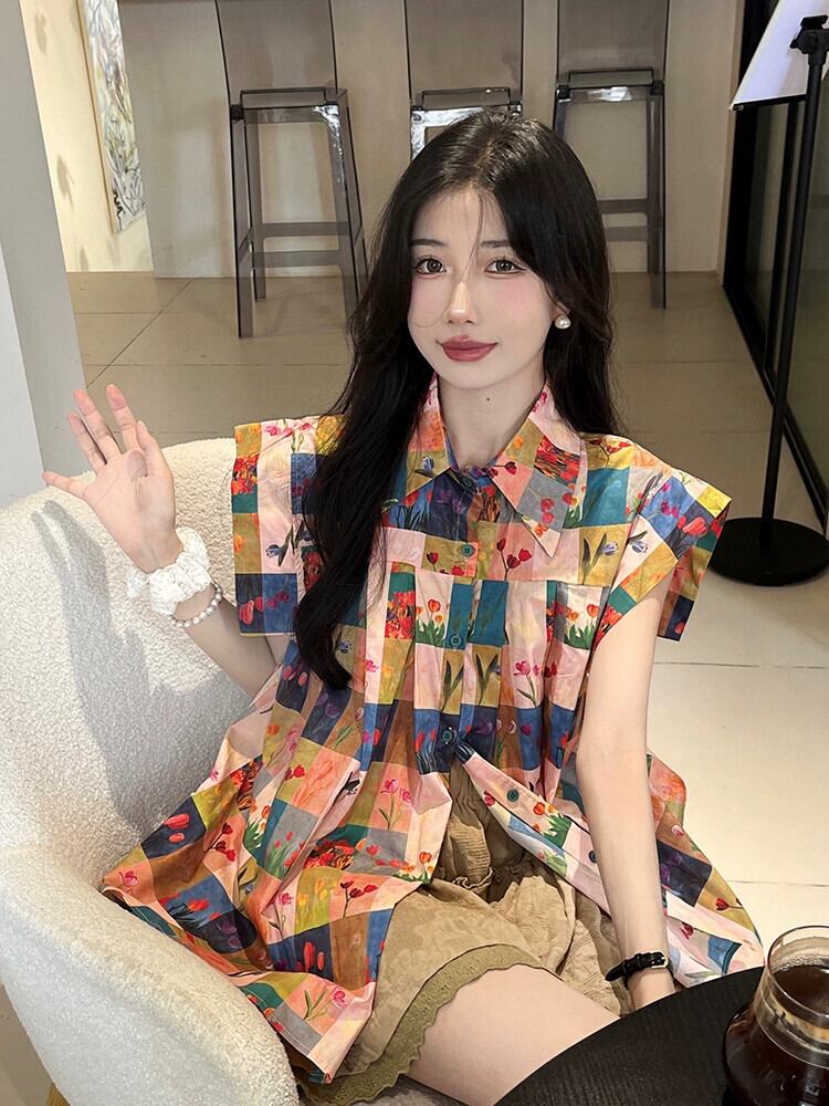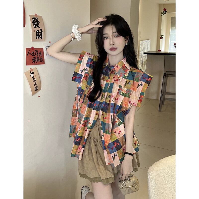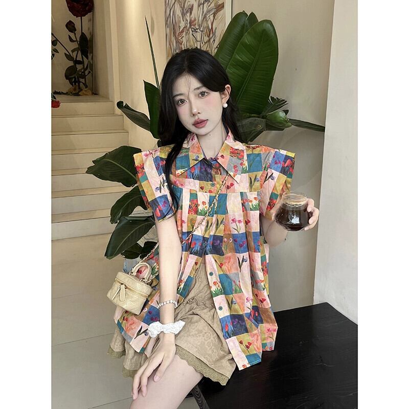 Feifei スリーブチェック柄花柄シャツレディース夏 2023 ニッチエストルーズシックトップ サマー 夏物 missk50729736065