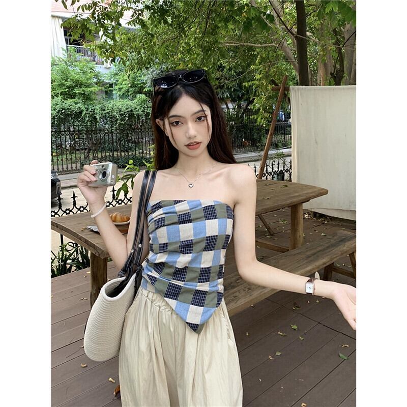 チェック柄チューブトップレディース2023夏新作甘い不規則なデザイン痩身アウタートップ 大人ガーリー スウィート キュート カジュアル サマー 夏物 missk69020726791