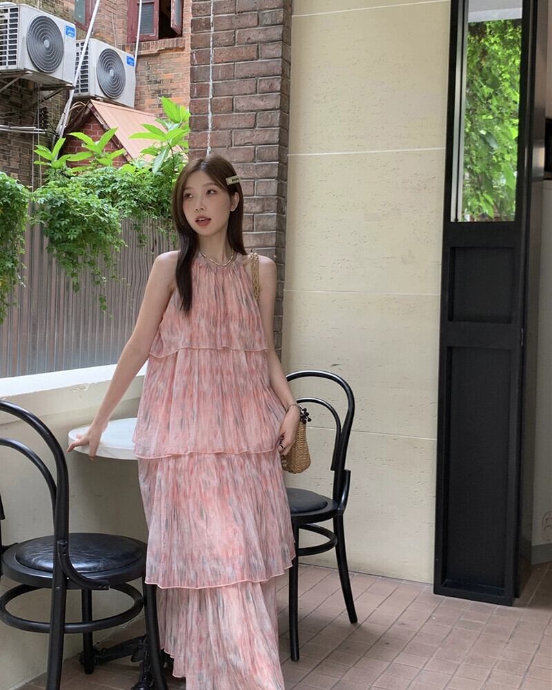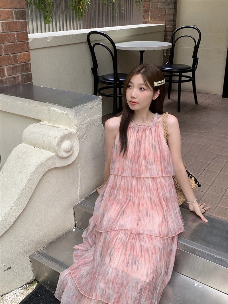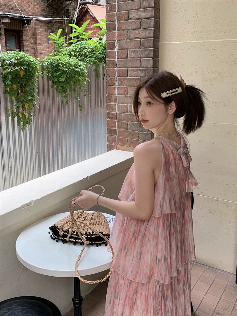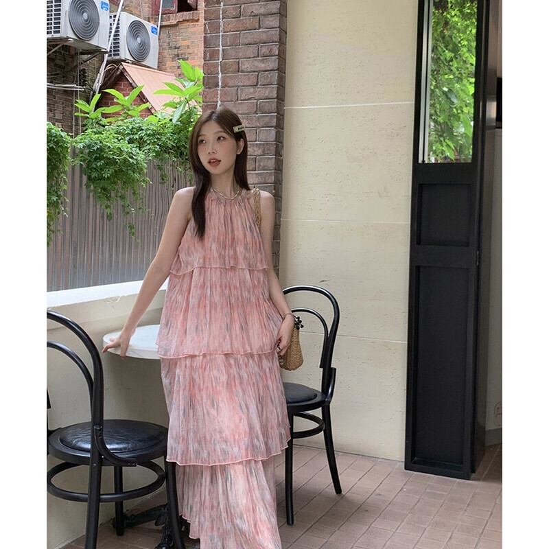 花ホルター妖精サスペンダードレスの女性の夏 2023 ノースリーブルースホリデービーチケーキロングドレス サマー 夏物 花柄 missk96216204664
