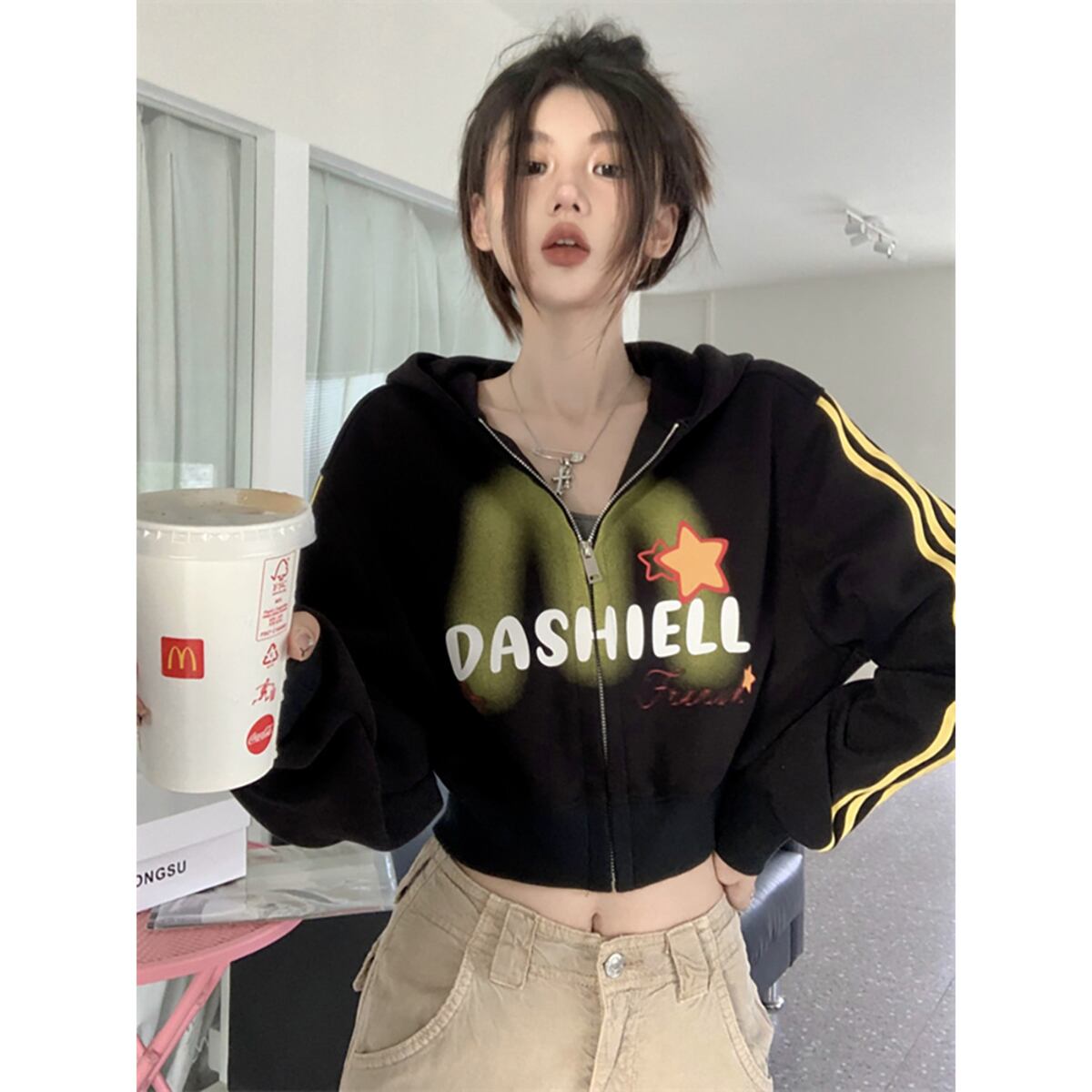 アメリカンレトロファッション対照的な色のフード付きスウェットシャツ初秋2023新デザインショート長袖ジャケットトップス女性 ロング オータム 秋物 missk99157041181