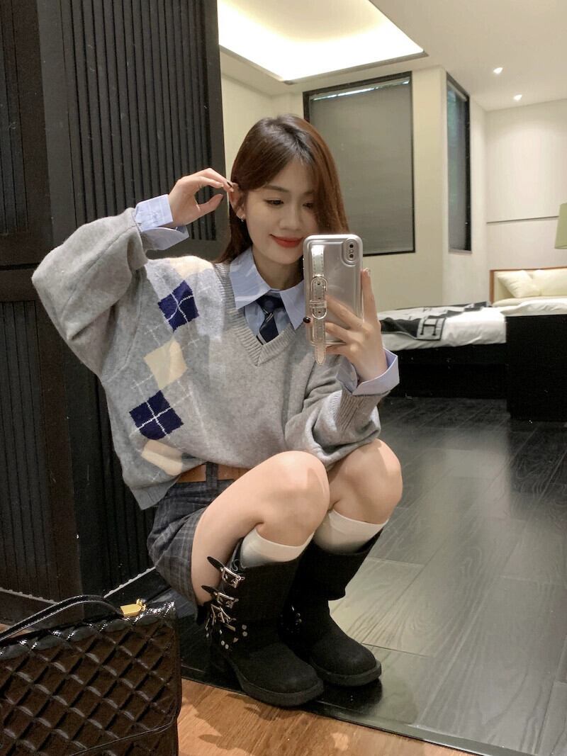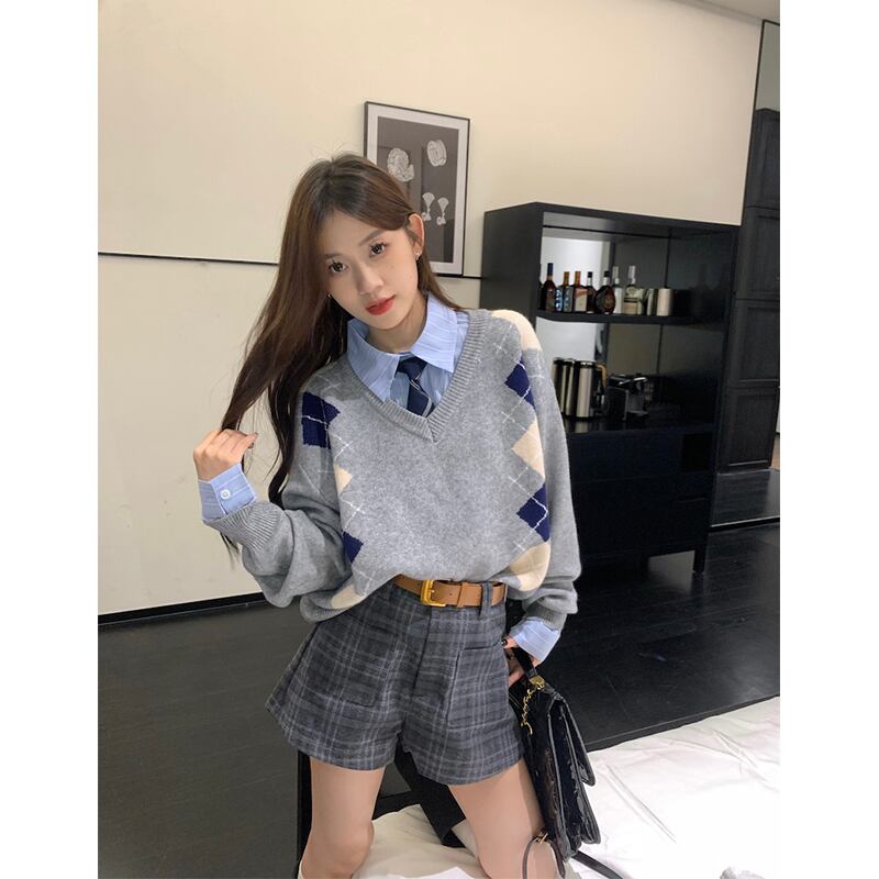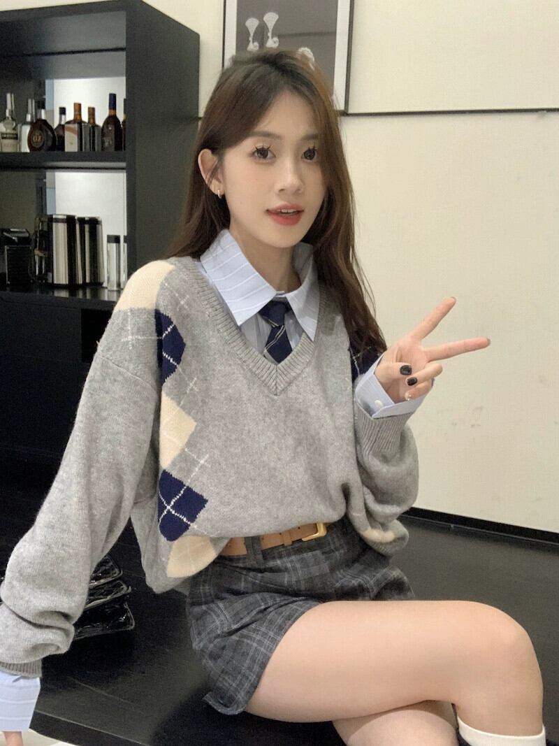 ダイヤモンド V ネック セーター レディース、秋バージョン 2023 新しいデザイン、対照的な色、ゆったりとしたアウターウェア、長袖ニット トップ ロング オータム 秋物 Vネック missk25465769829