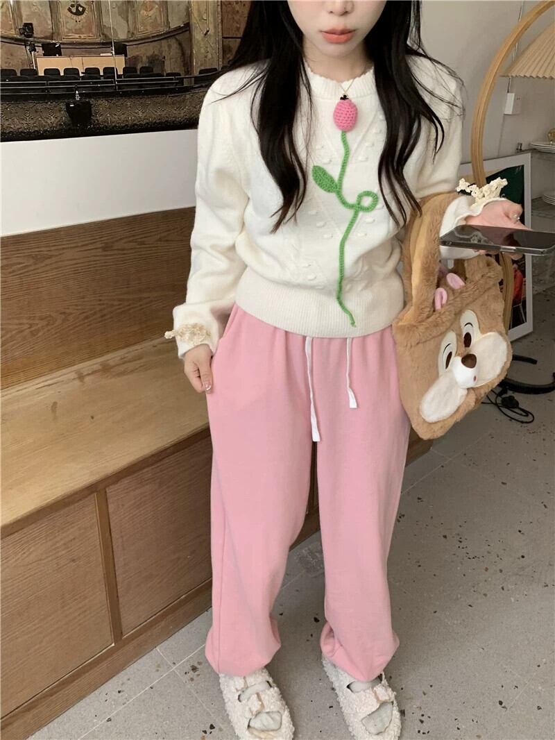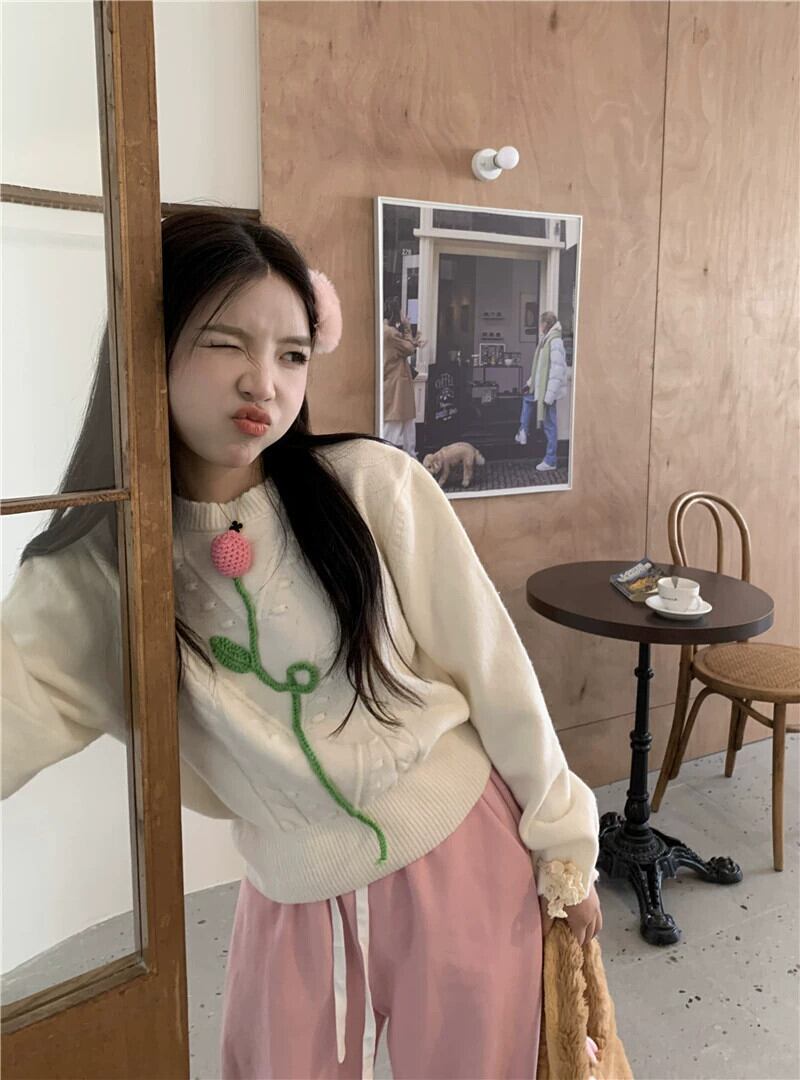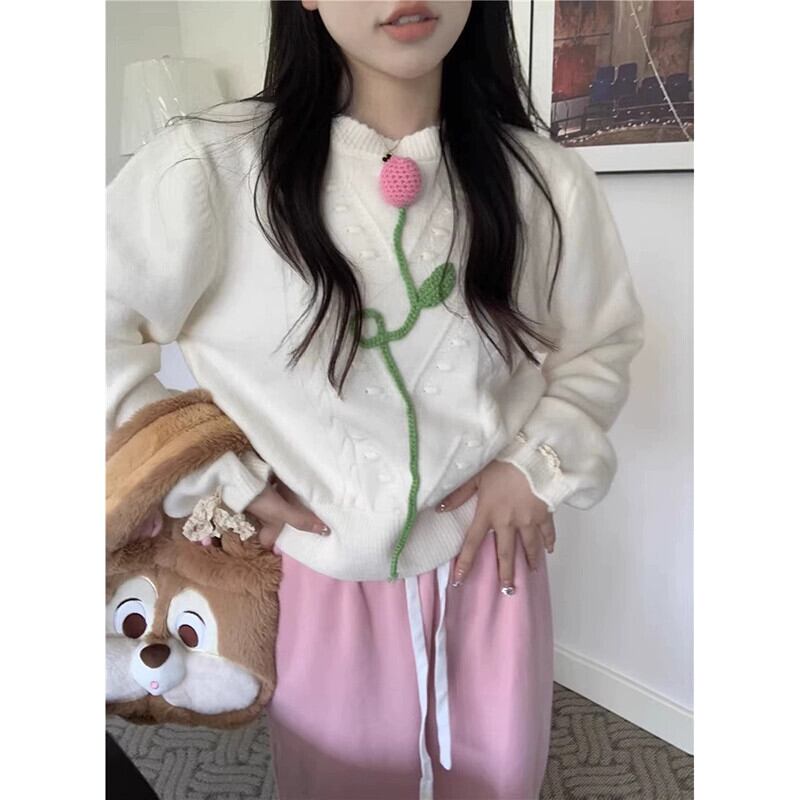 甘いニットセーターの女性の秋 2023 新デザインニッチ立体花ルーズ長袖トップ ロング 大人ガーリー スウィート キュート カジュアル オータム 秋物 フラワーデザイン missk57152191612
