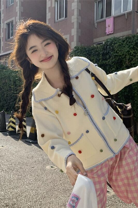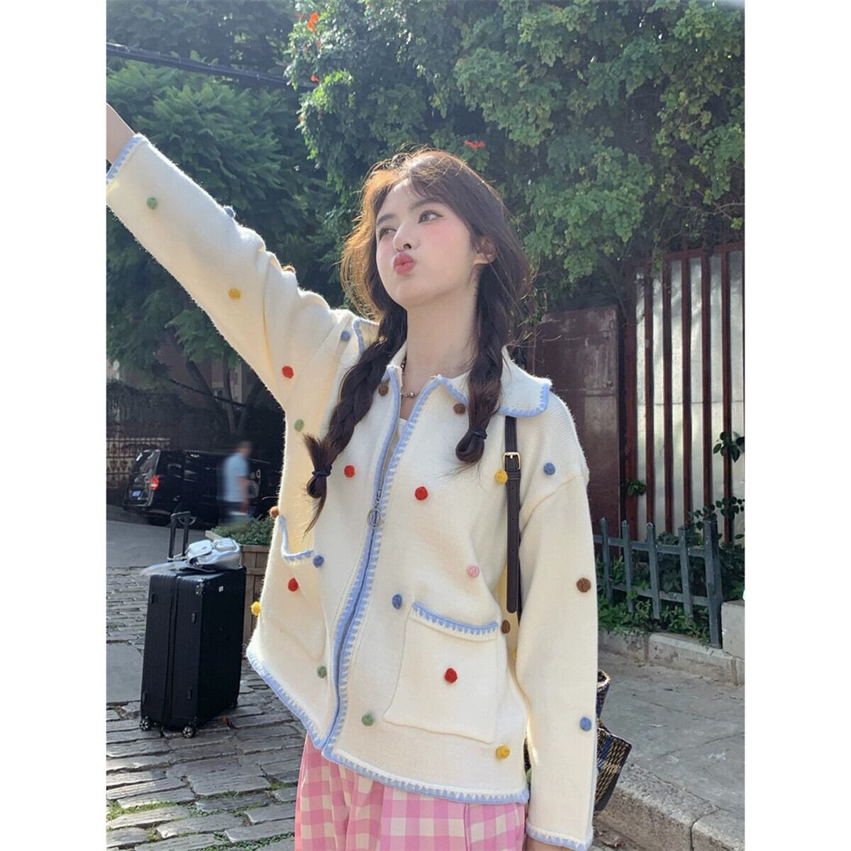 2023 秋の新スタイル緩い老化を軽減する立体的なカラフルなボールニットトップ人形の襟ジッパーカーディガン女性 オータム 秋物 missk36458087970