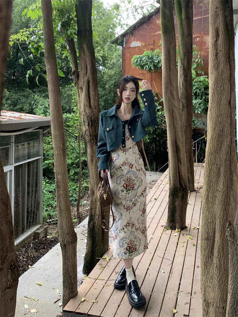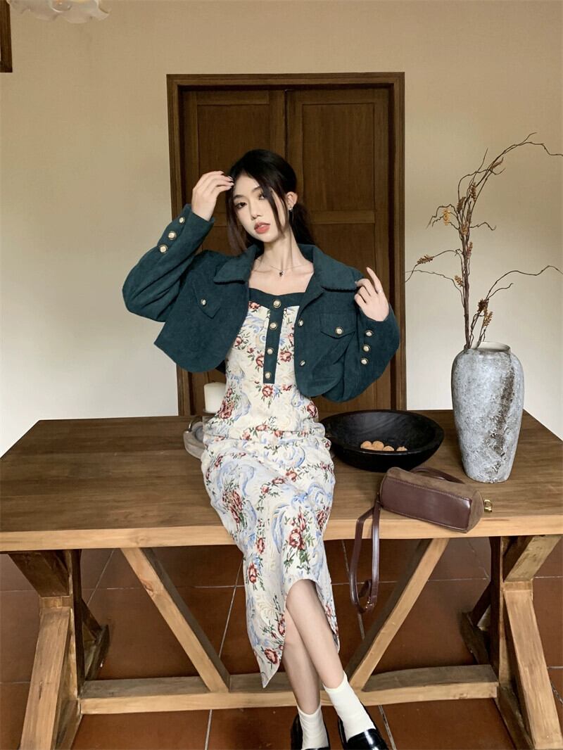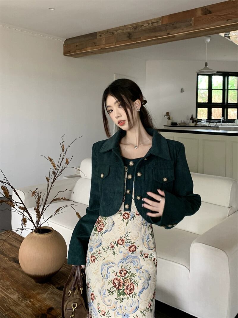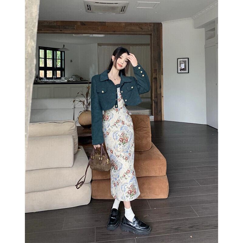 レトロフレンチショートコーデュロイジャケットジャカードサスペンダードレス女性秋 2023 新しいファッションツーピースセット オータム 秋物 missk42146180560