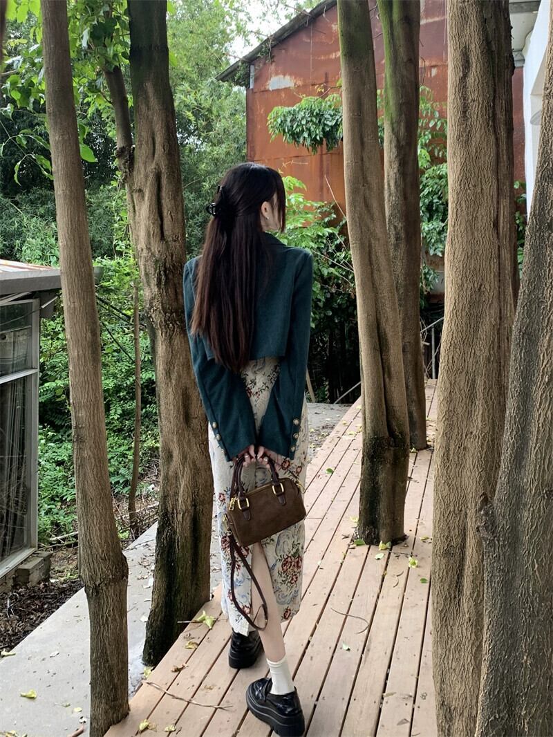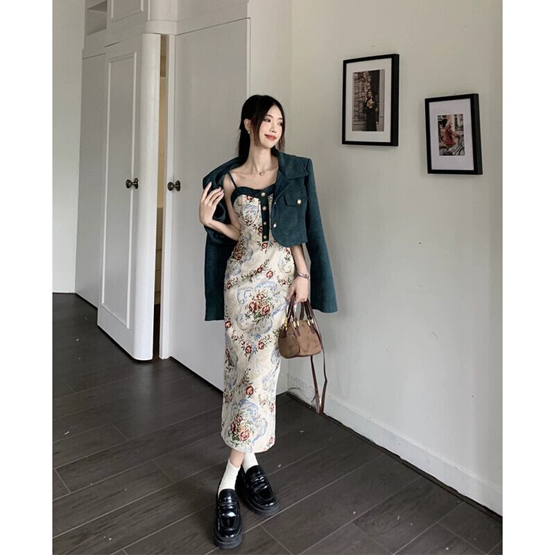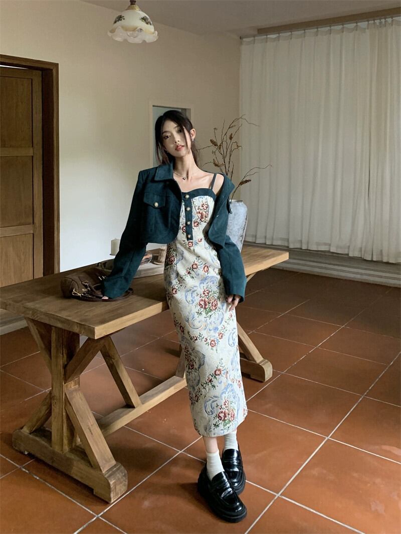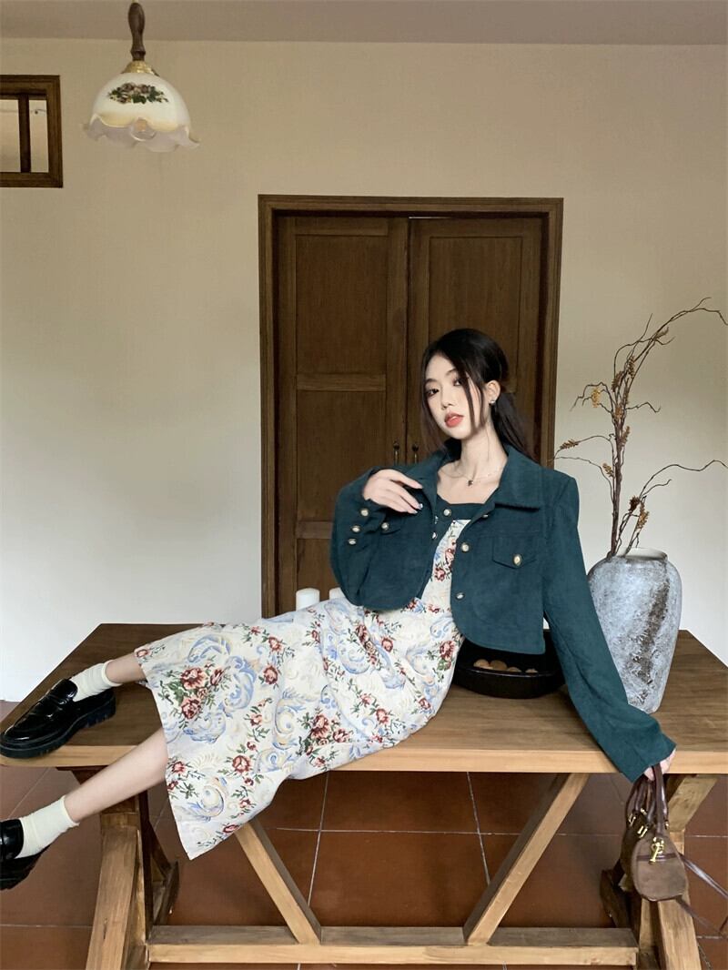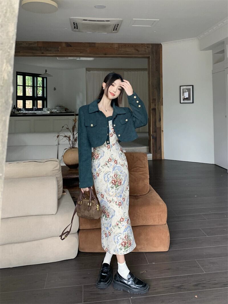 レトロフレンチショートコーデュロイジャケットジャカードサスペンダードレス女性秋 2023 新しいファッションツーピースセット オータム 秋物 missk42146180560