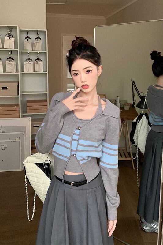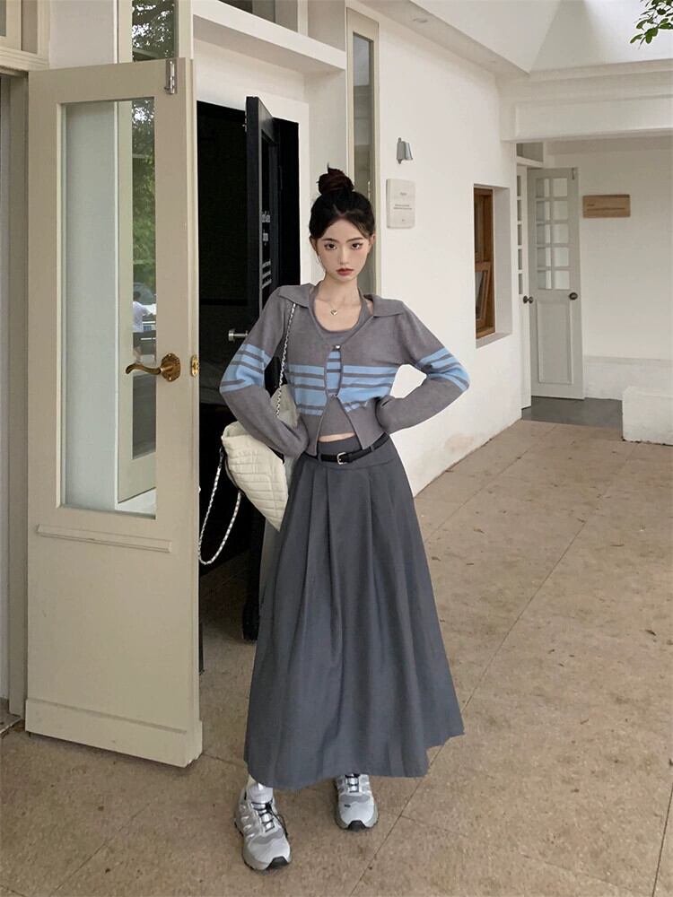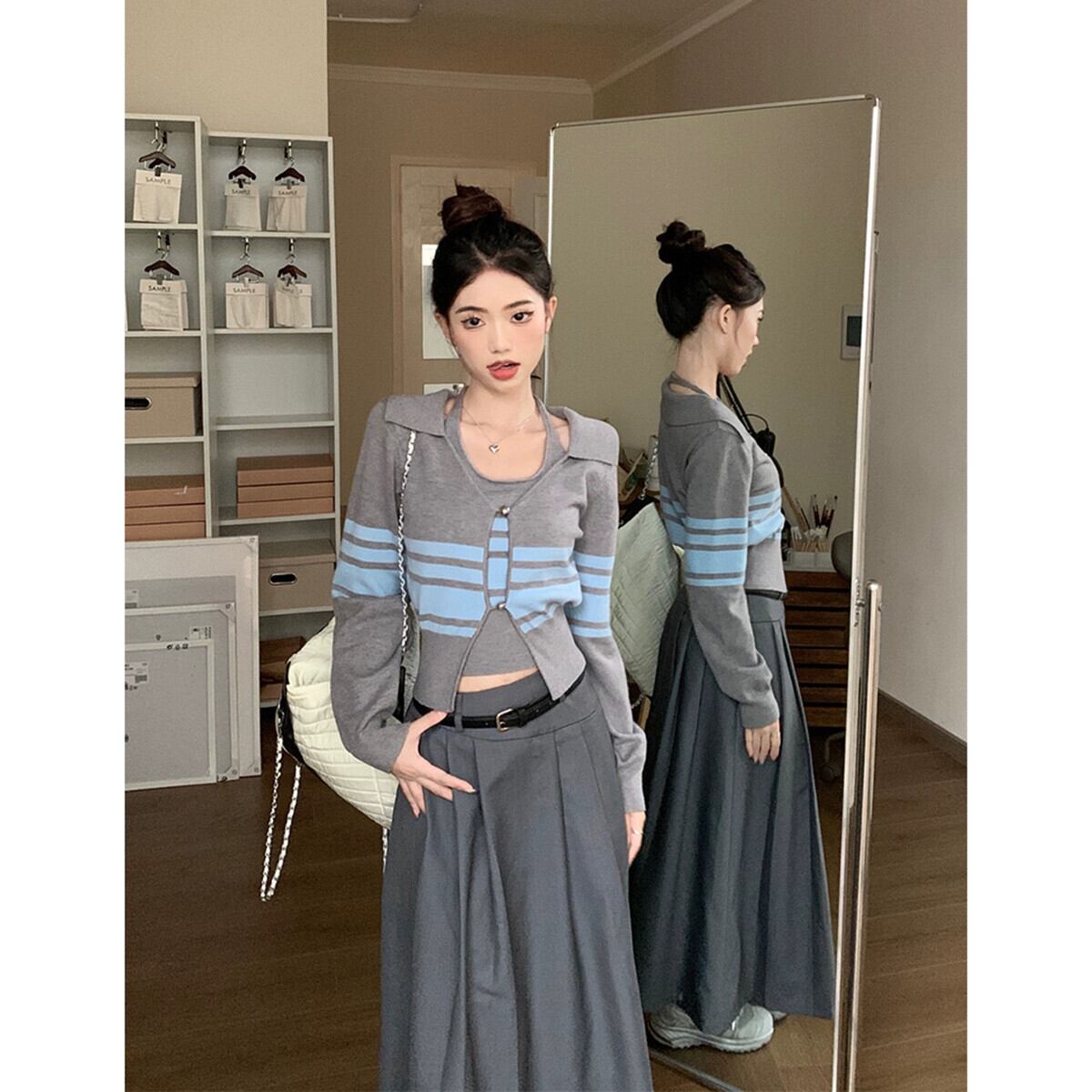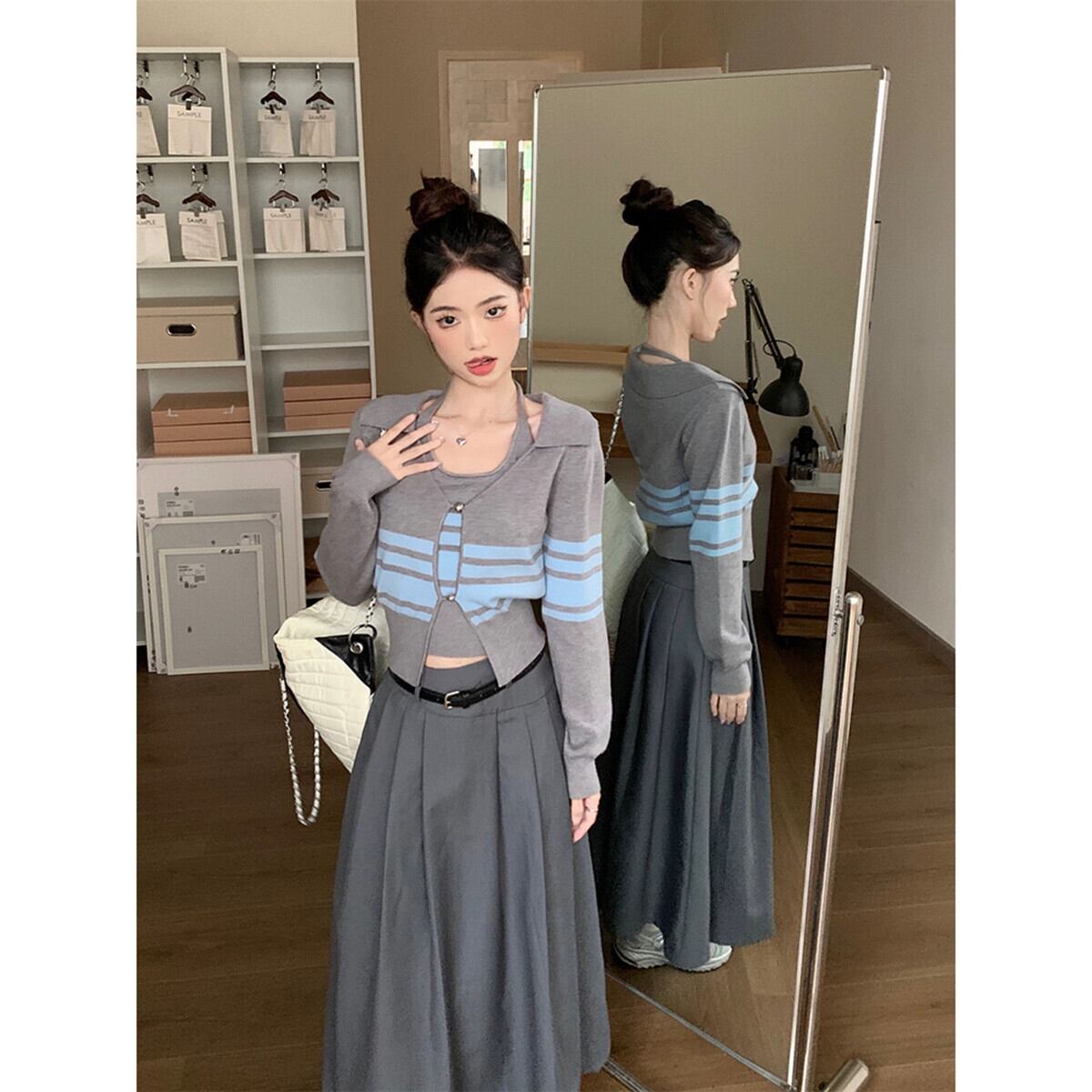 有能コントラストストライプ長袖ニットカーディガンスリーピーススーツ秋 2023 新しいハイウエストグレースカート女性 ロング オータム 秋物 missk17382637755