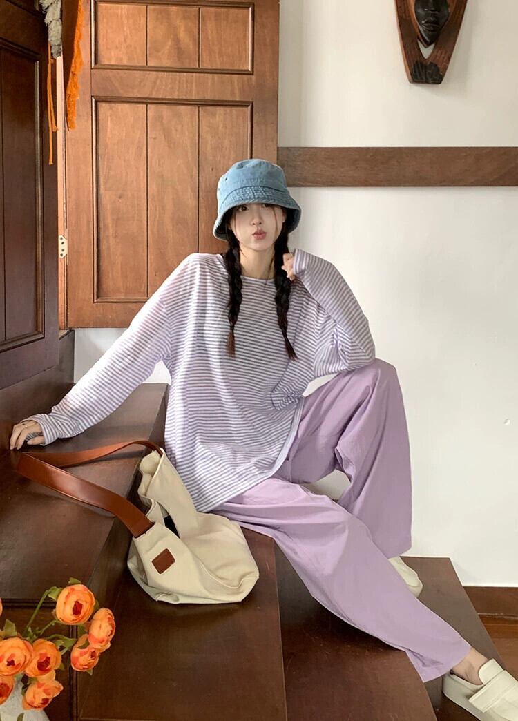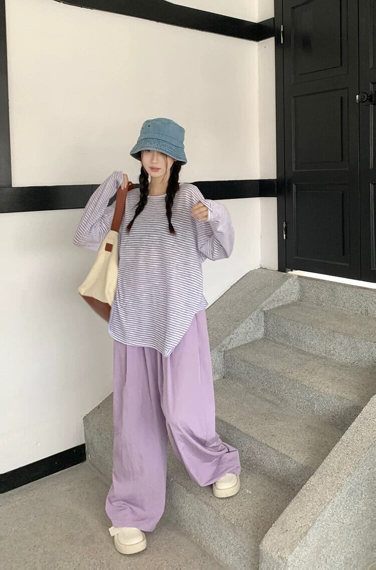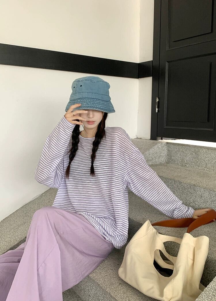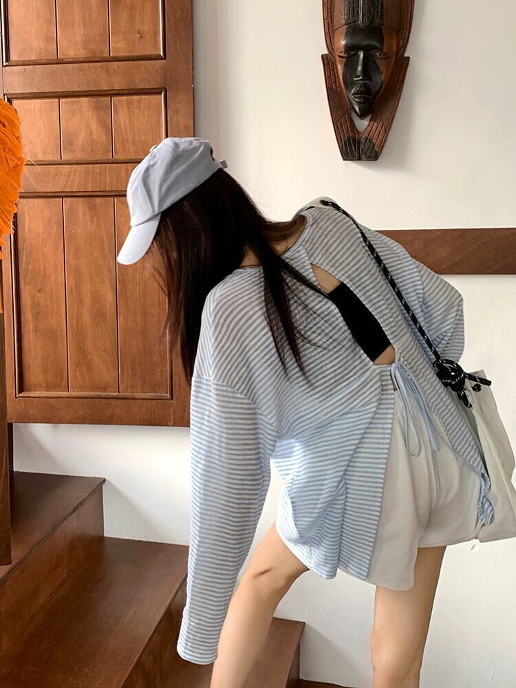 背中の開いたストライプの薄い長袖日焼け止め T シャツに注意してください夏の新しいカジュアルなワイドレッグ パンツの女性の初秋のスーツ ロング サマー 夏物 オータム 秋物 Tシャツ missk84175082527