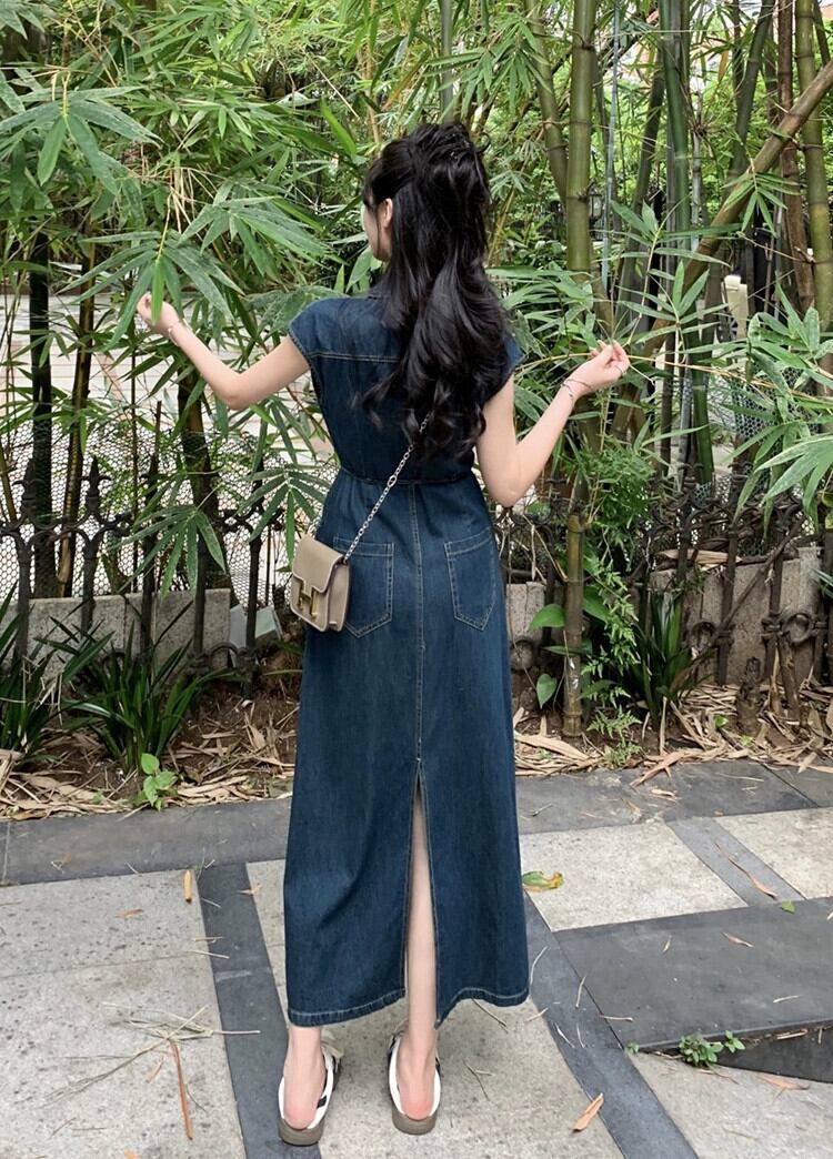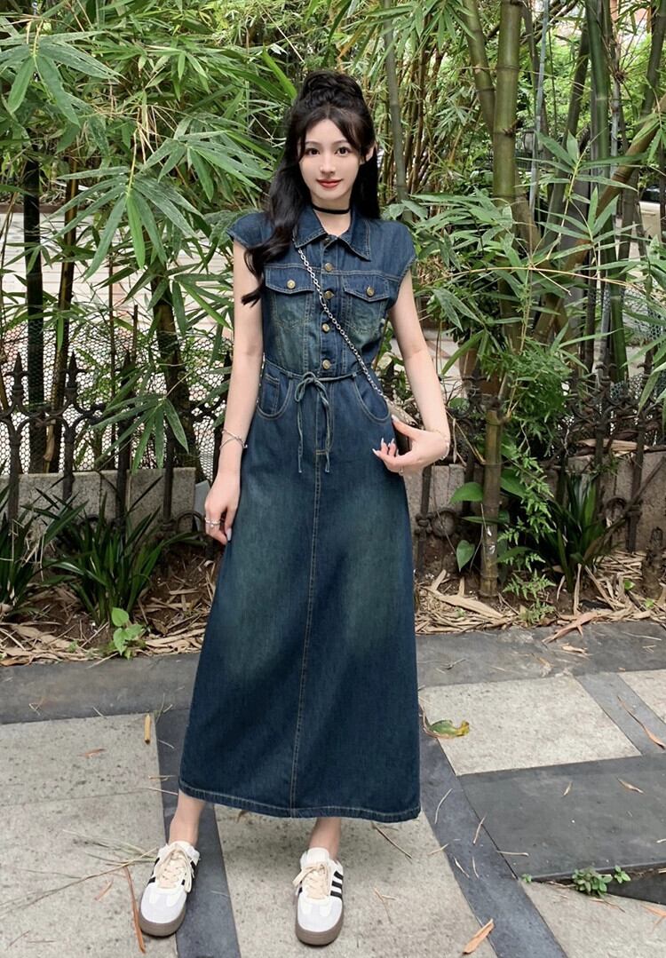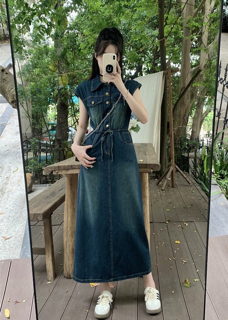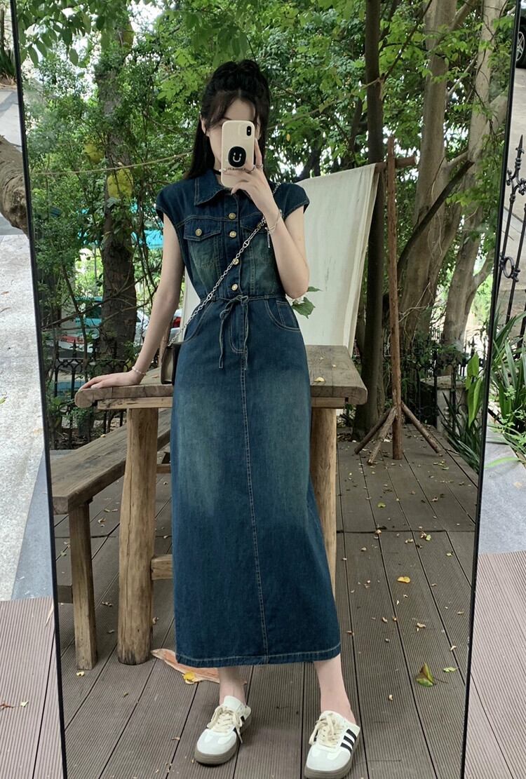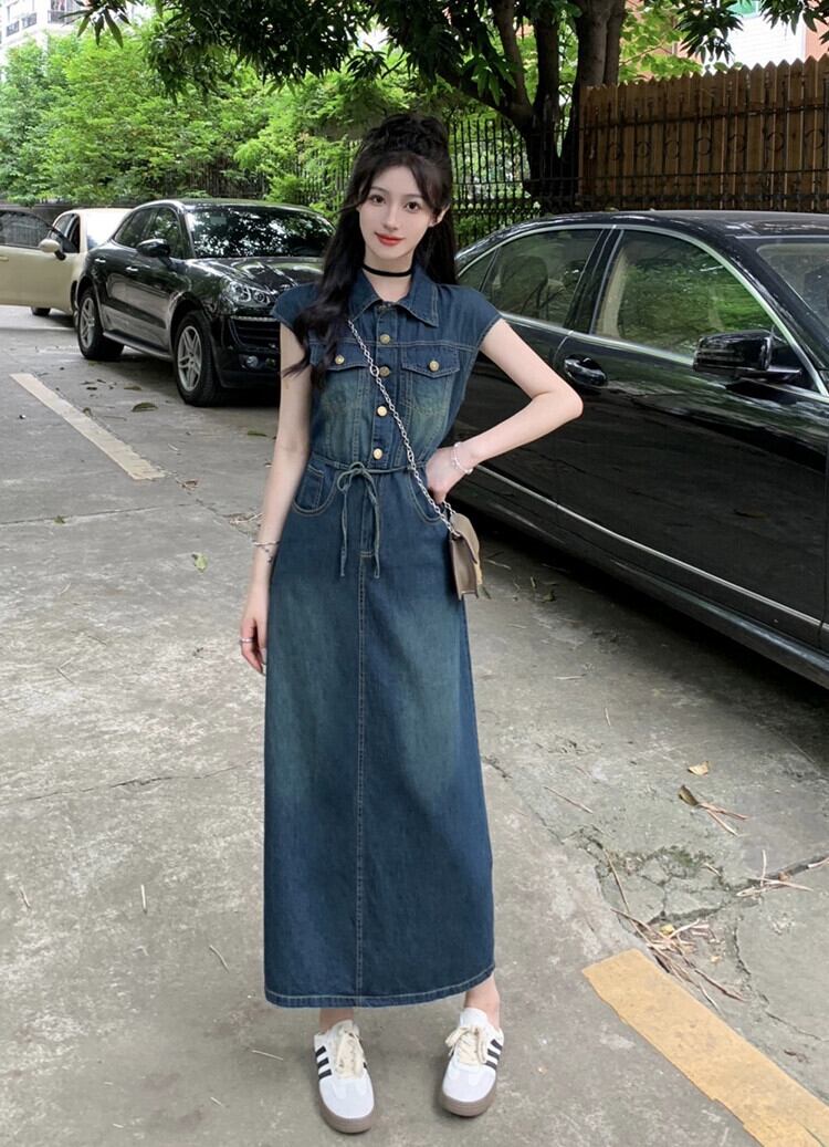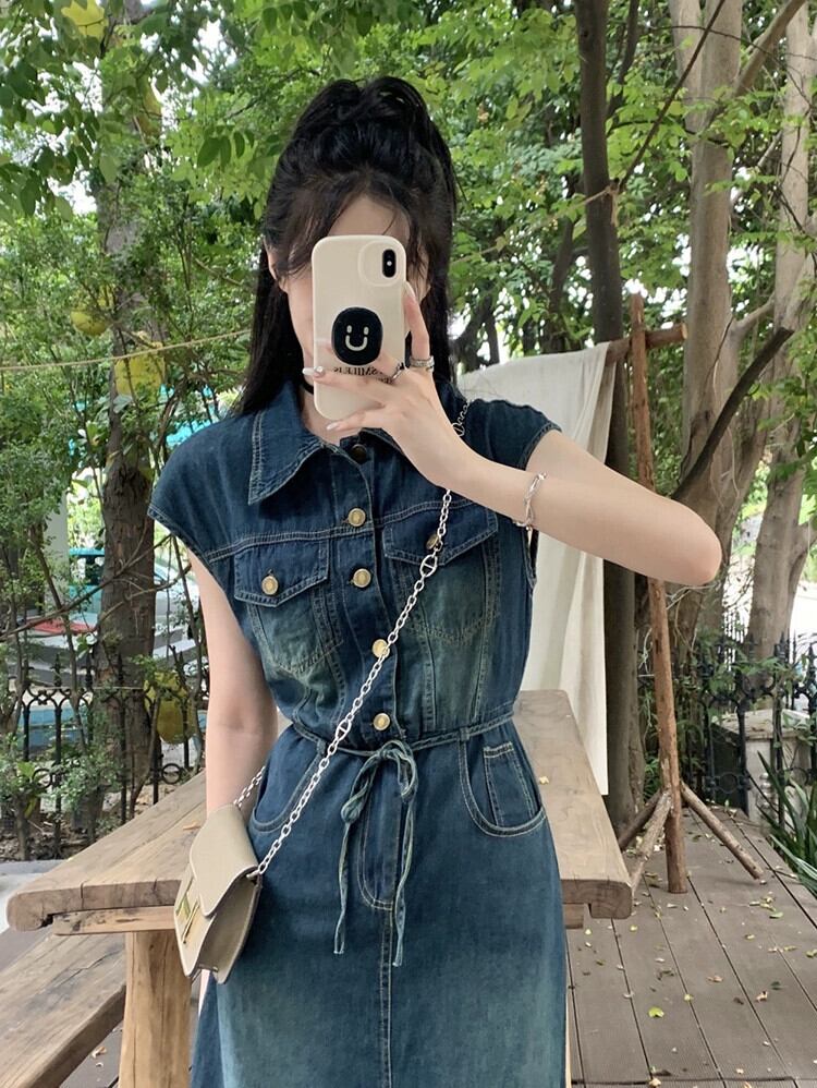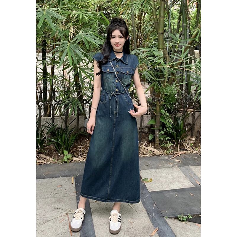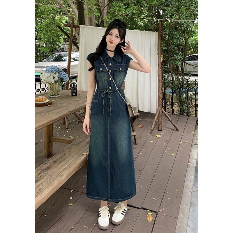 ポロ襟デニムベストドレス女性の夏 2023 新しいレトロシングルブレストウエスト痩身甘くてクールなロングスカート 大人ガーリー スウィート キュート カジュアル サマー 夏物 missk17814178011