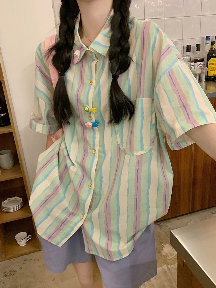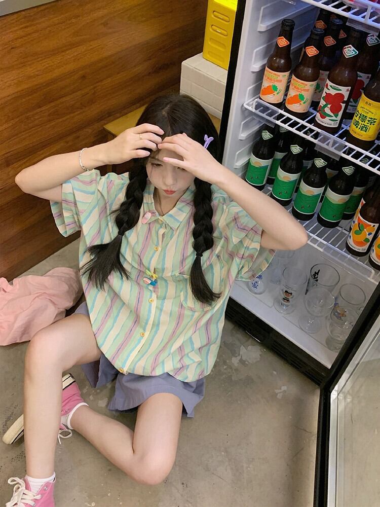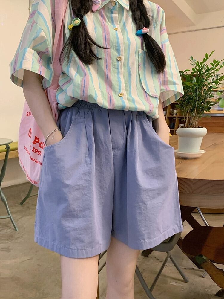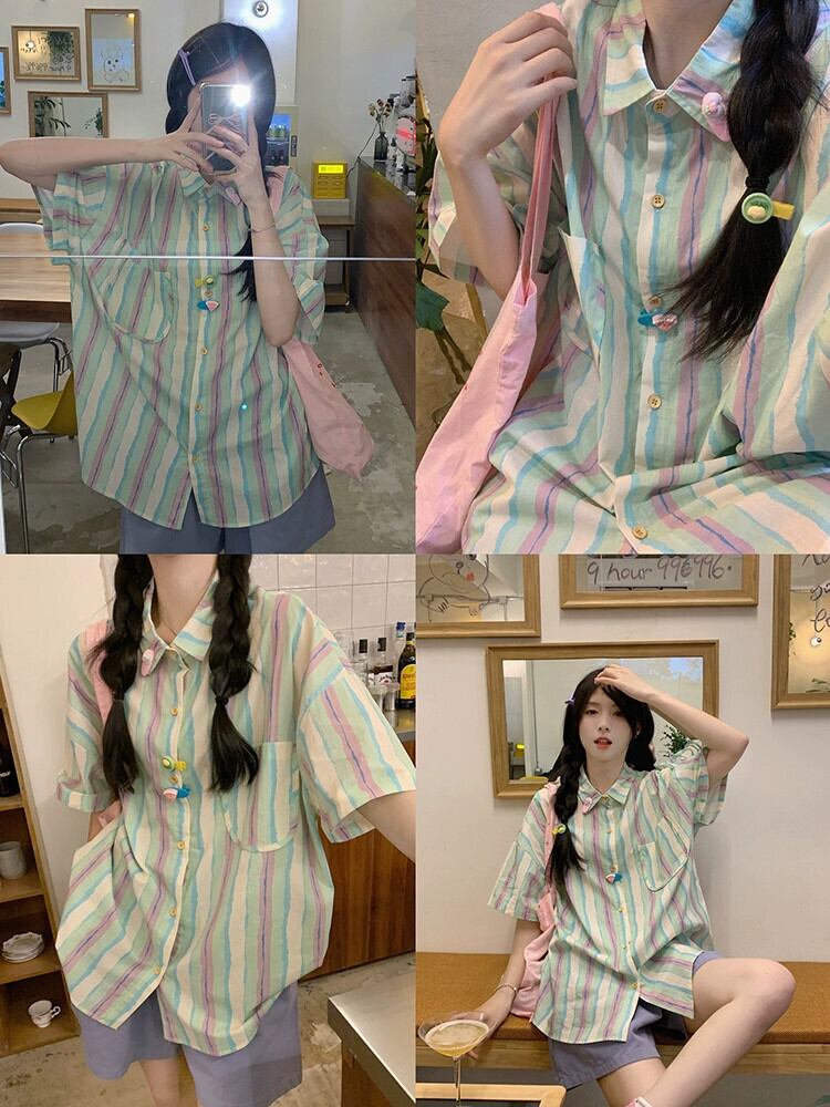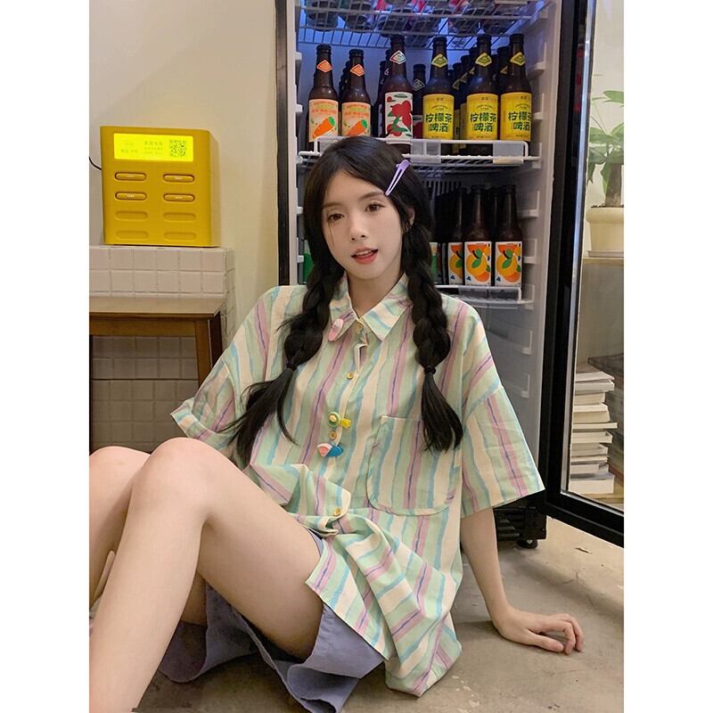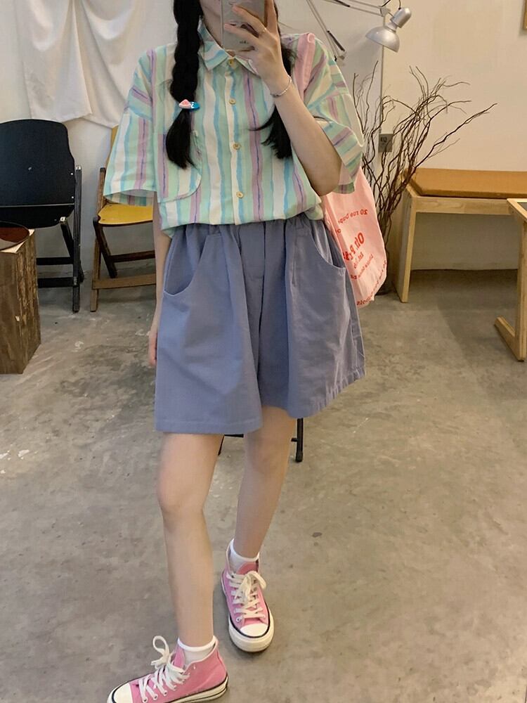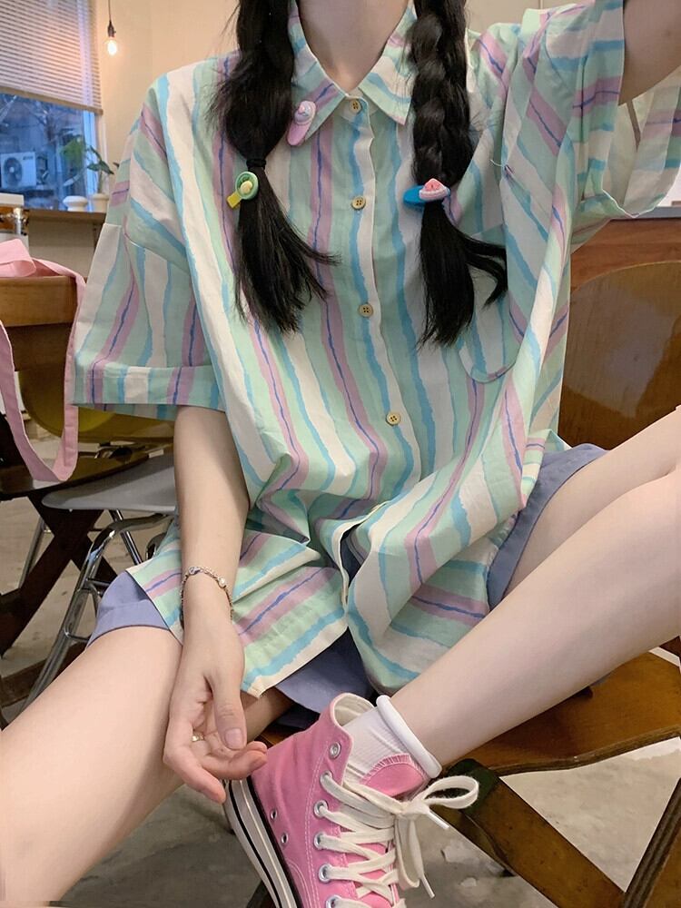 ドーパミンは老化を軽減するストライプのルーズシャツ+ハイウエストワイドレッグカジュアルパンツの女性の新しい夏の2点セットを着ています サマー 夏物 missk5048253285