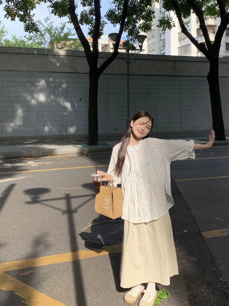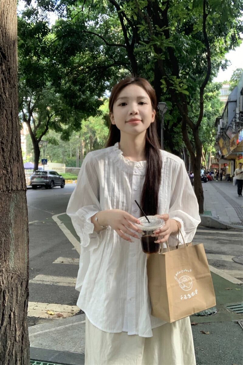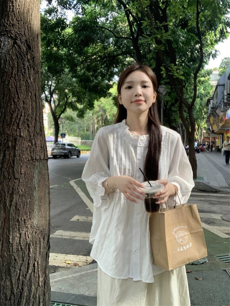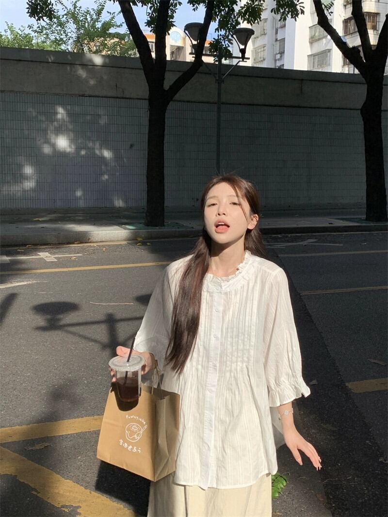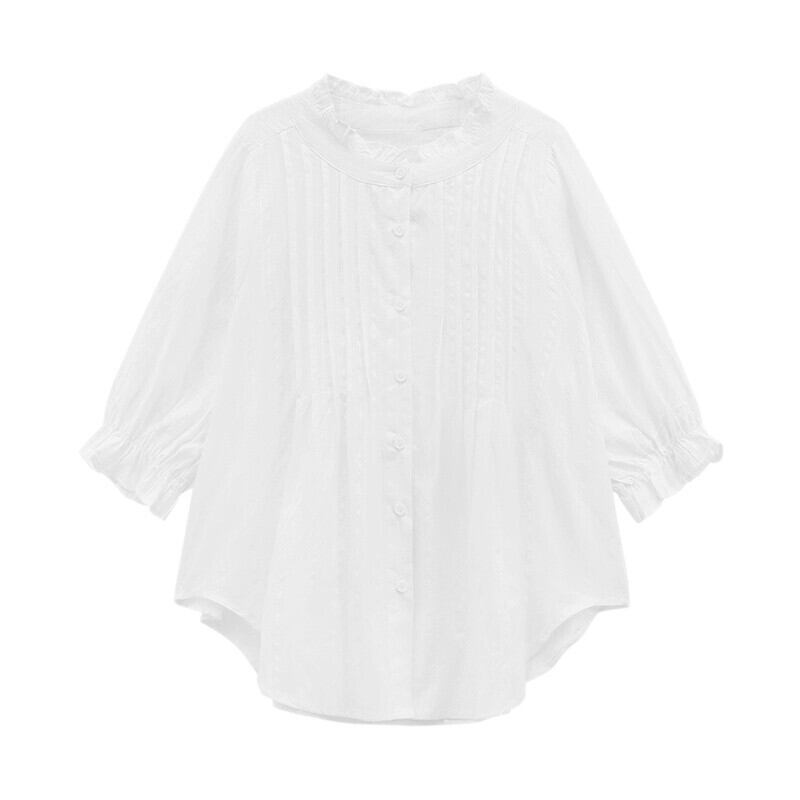 パフスリーブレーススタンドカラー白シャツ女性秋 2023 新しい甘いフレンチプリーツ七分袖アウタートップ ホワイト 大人ガーリー スウィート キュート カジュアル オータム 秋物 missk59903535362