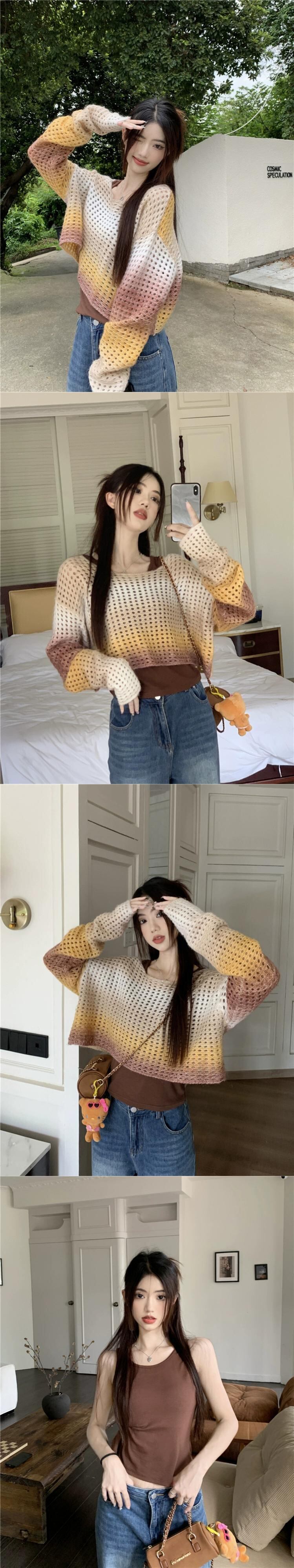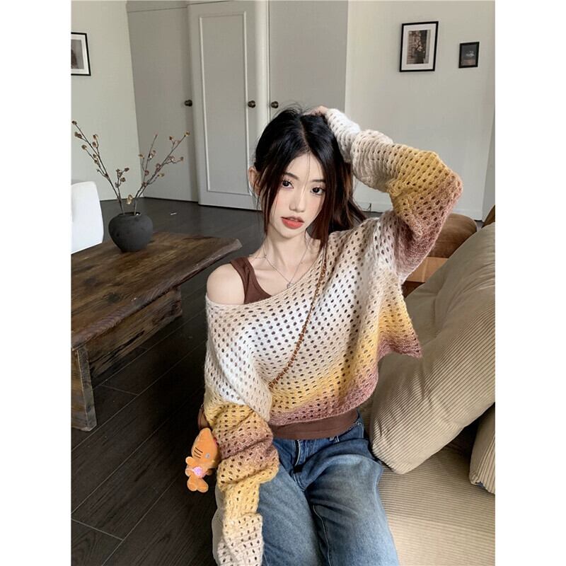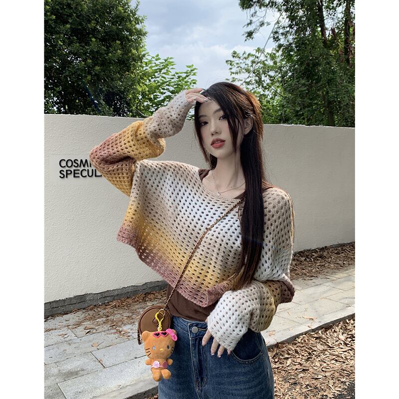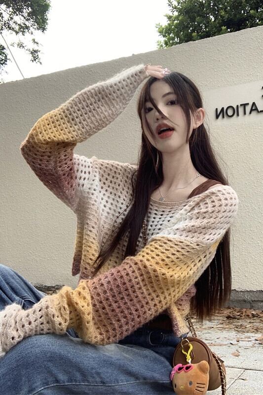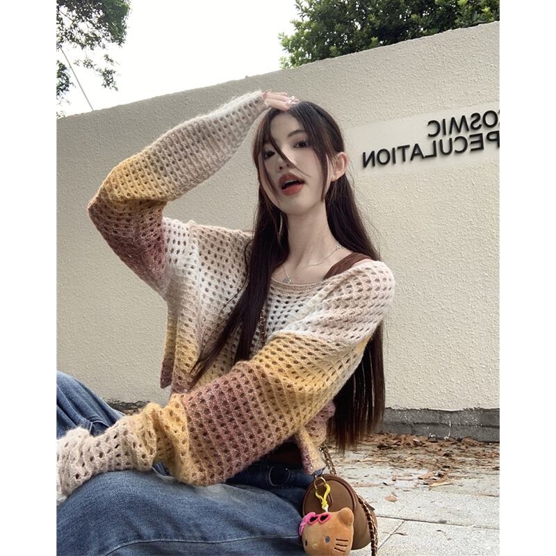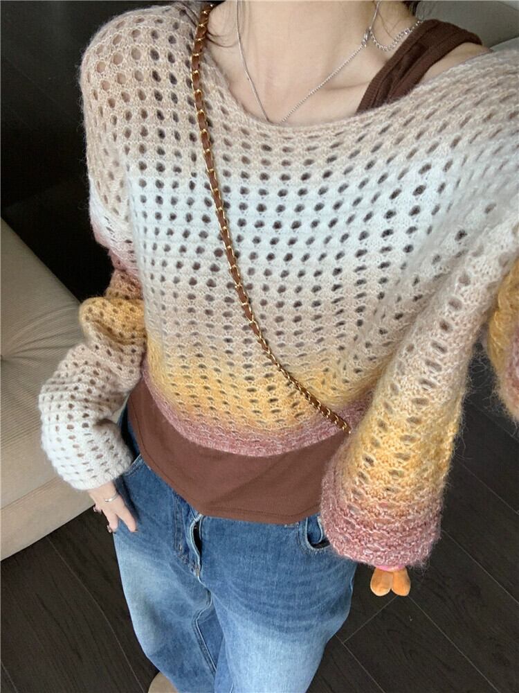 グラデーションカラー中空長袖セーターブラウス女性の秋バージョン 2023 新デザインルーズニットトップ ロング オータム 秋物 missk64093621646