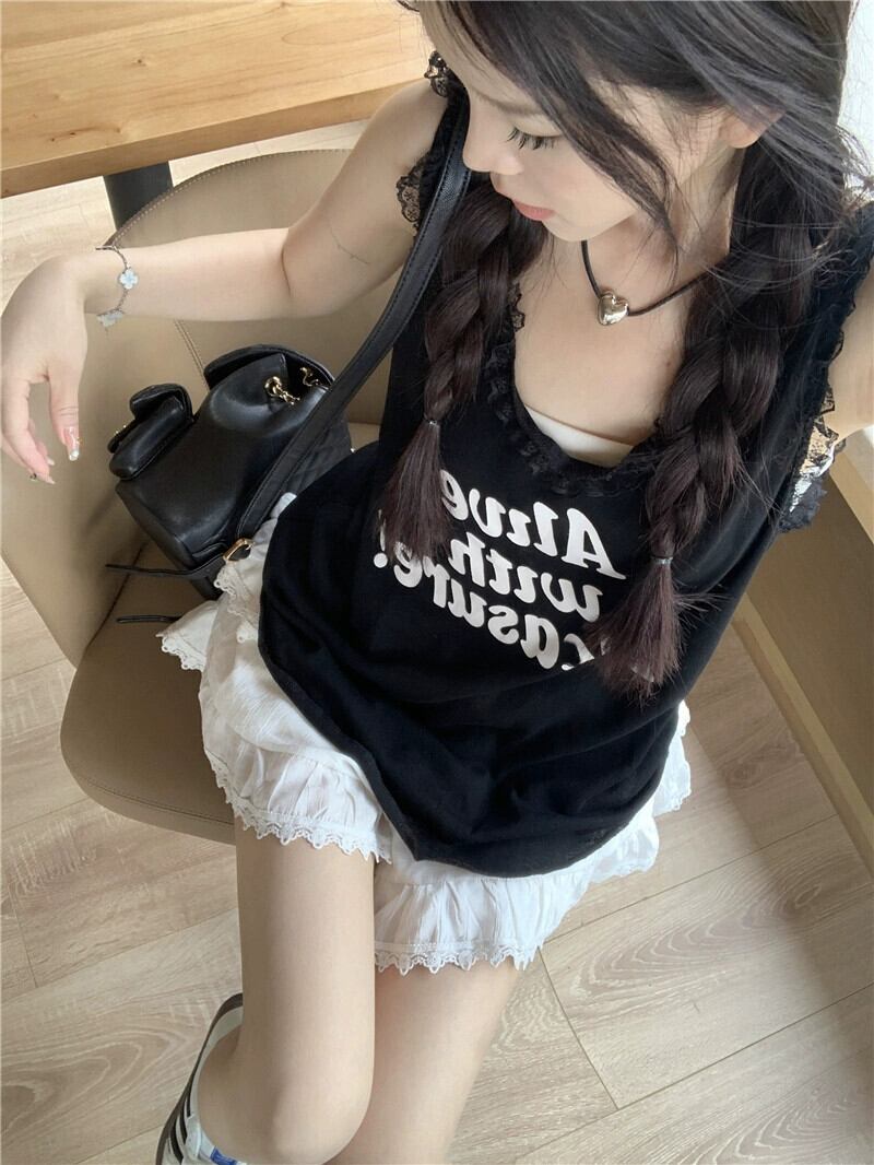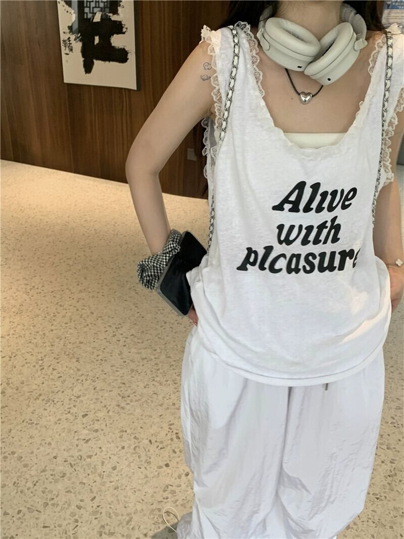 レーススプライシングノースリーブベスト Tシャツ女性イン夏の新しいスタイルルーズカジュアルレタープリント多用途トップ サマー 夏物 missk66055803758