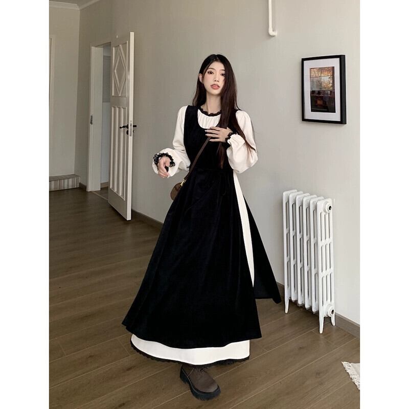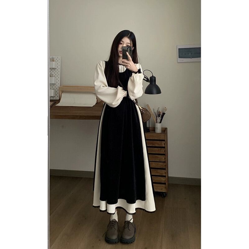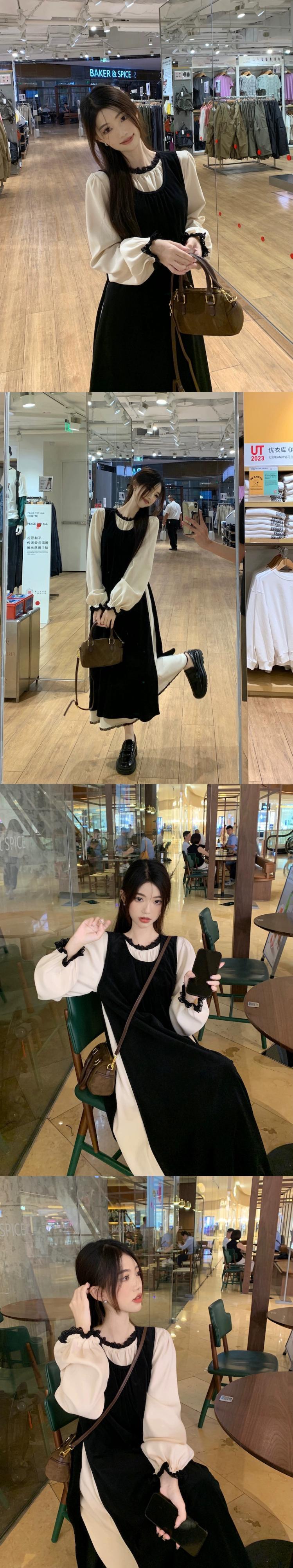 レトロな対照的なカラーデザインレースパッチワークウエスト痩身ドレススーツ女性秋 2023 新しいツーピースセット オータム 秋物 missk31510581013