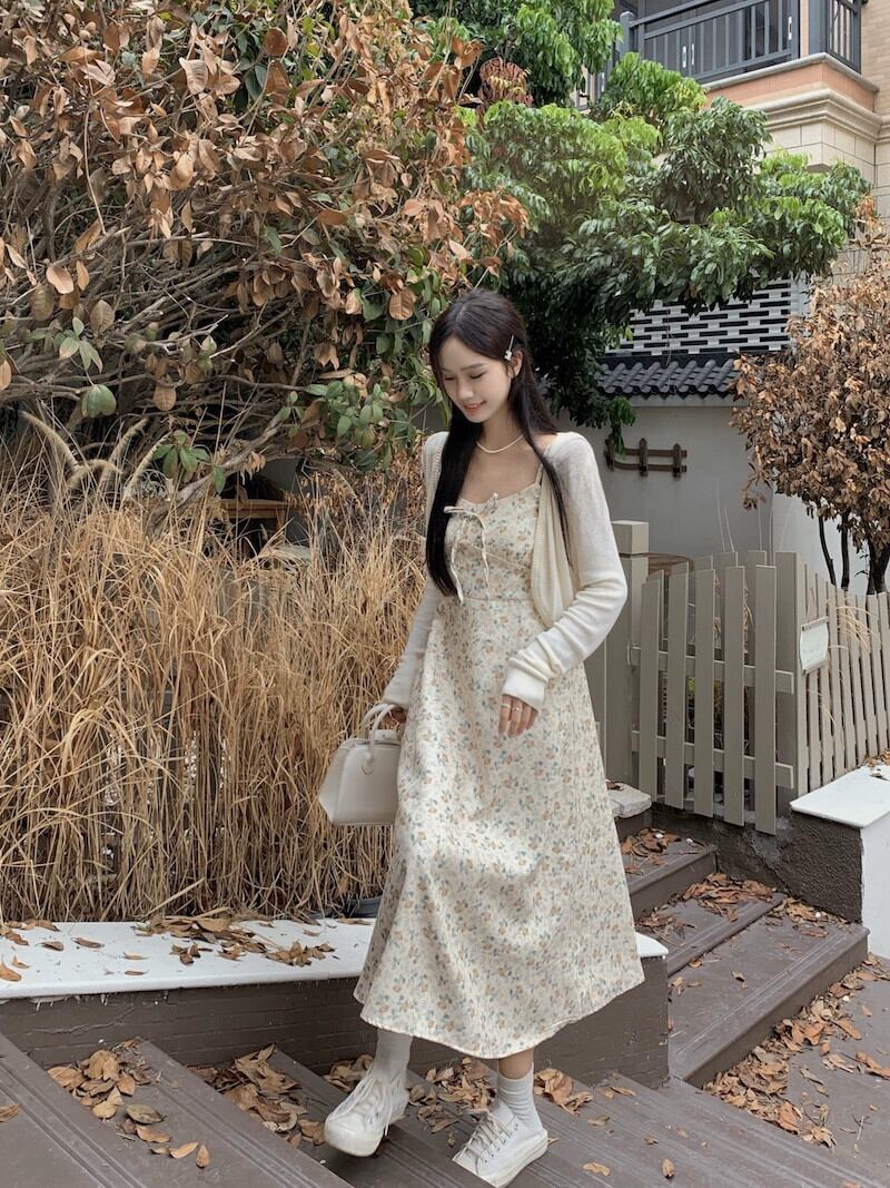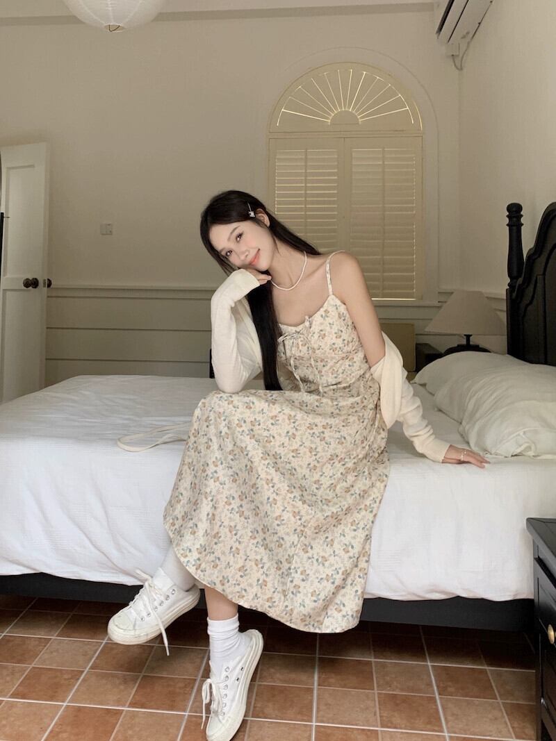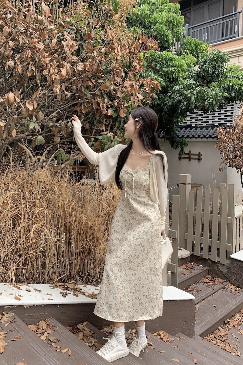 色:アプリコットカーディガン,アプリコットフラワーサスペンダースカート