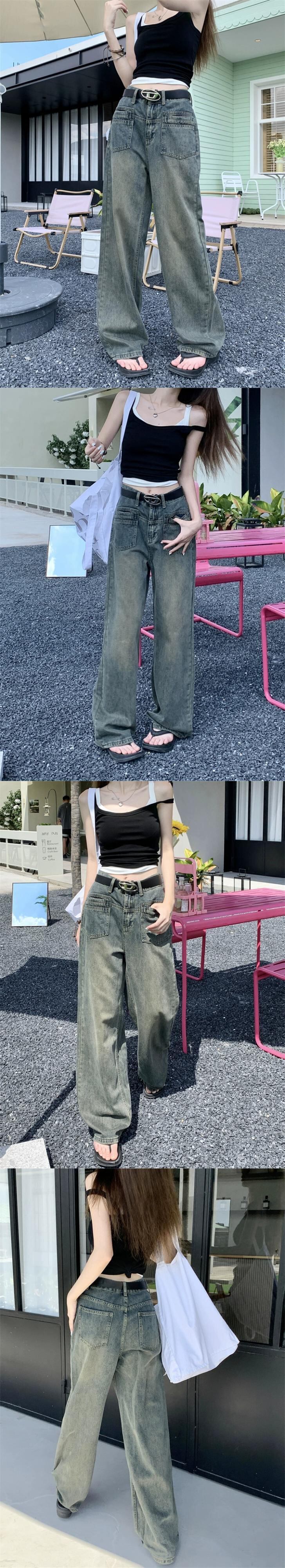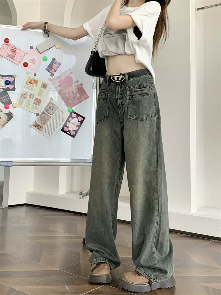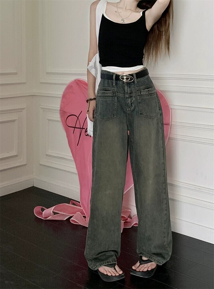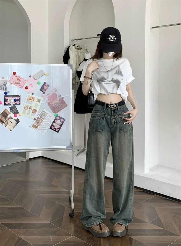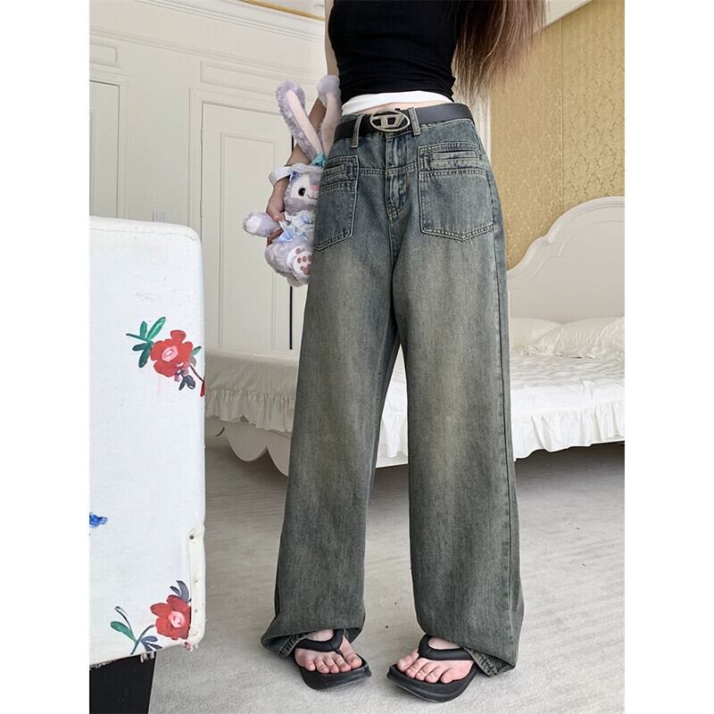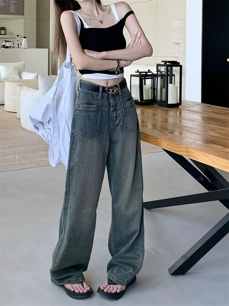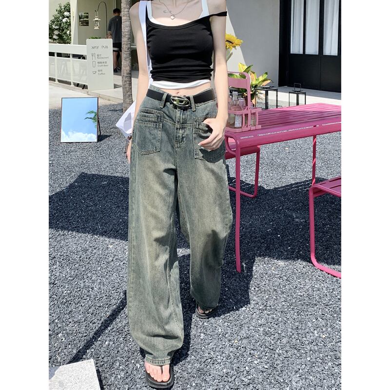 2023 夏の新しいスタイルのレトロなオールドファッション多用途ハイウエストスリムジーンズレディースストレートフロアレングスワイドレッグパンツ サマー 夏物 missk80901274182