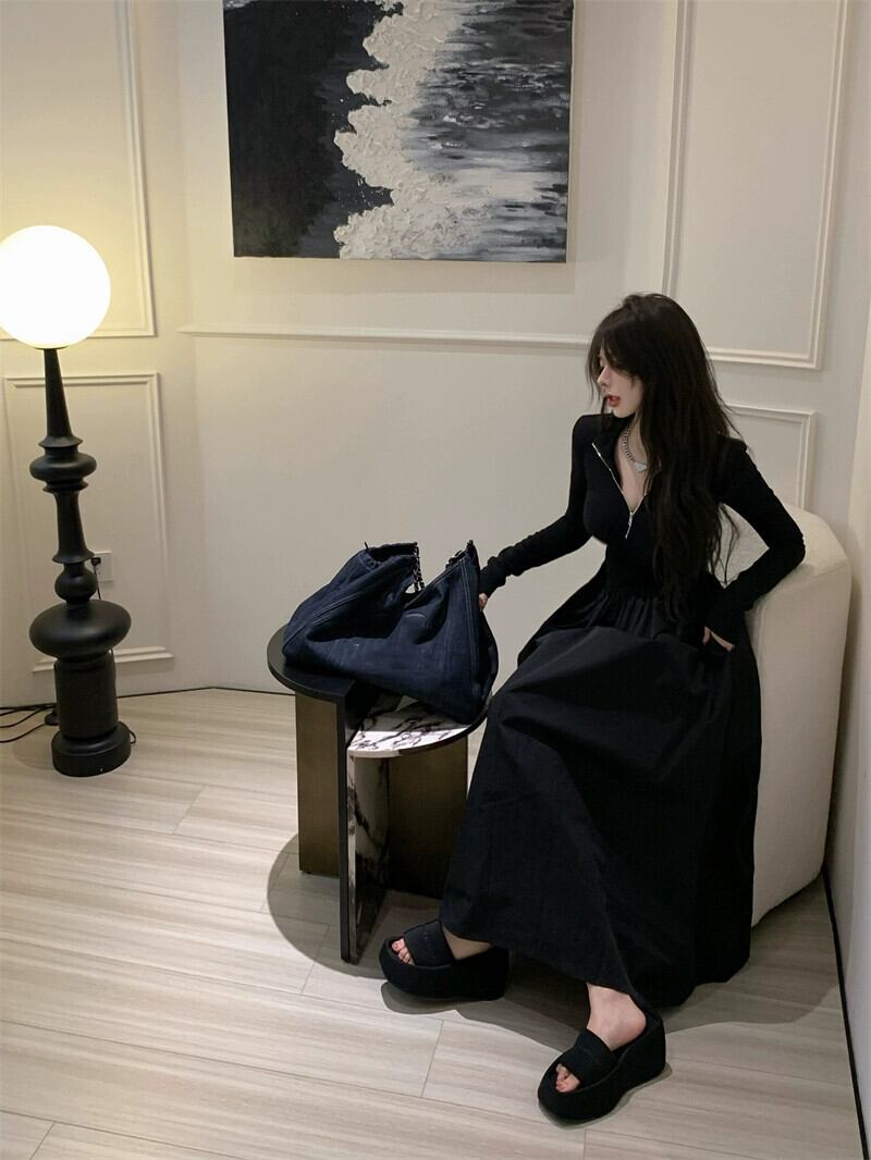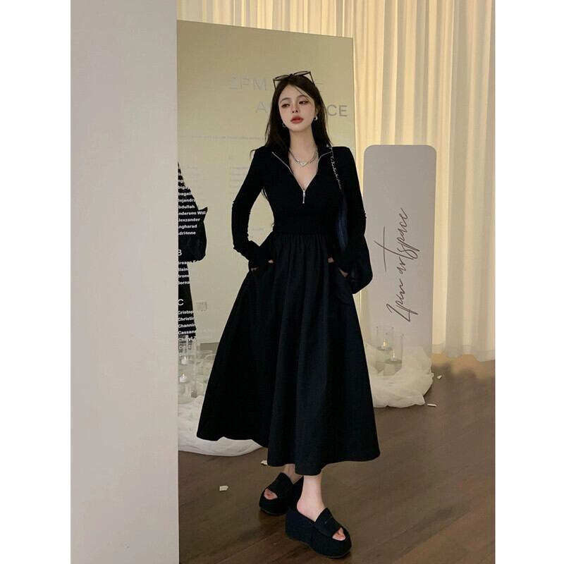シックなデザインのニットスプライシングドレスの女性の秋 2023 新しいスタイルのウエスト痩身長袖大きな裾スカート ロング オータム 秋物 missk45050653124