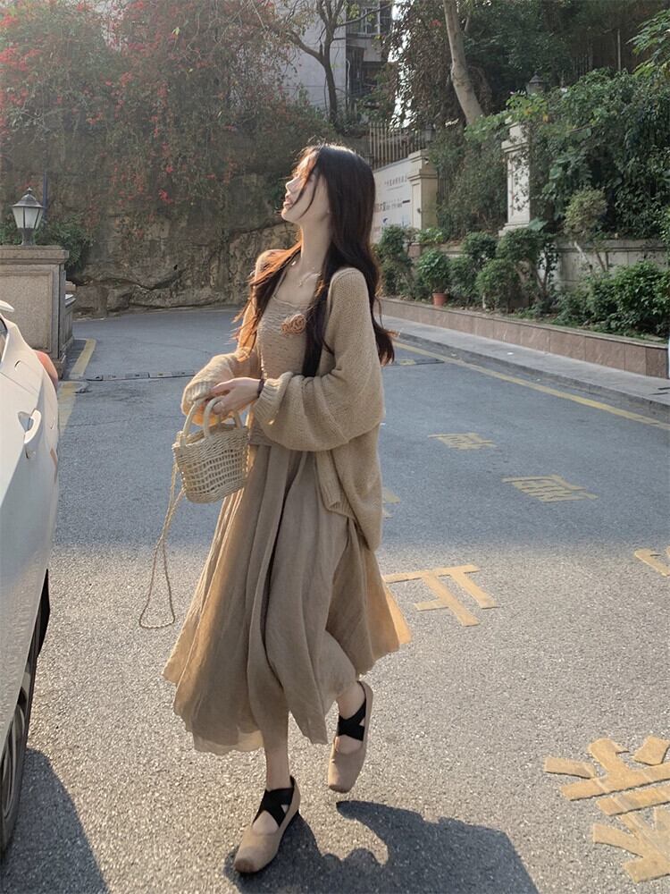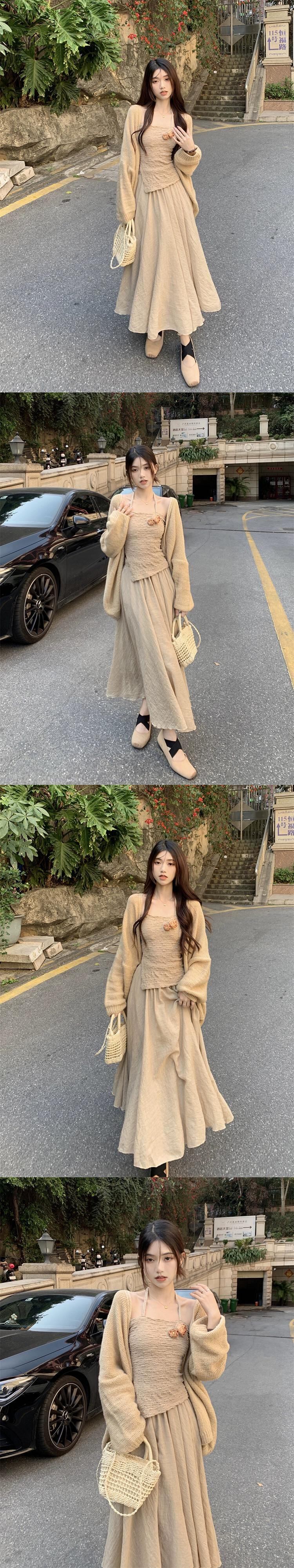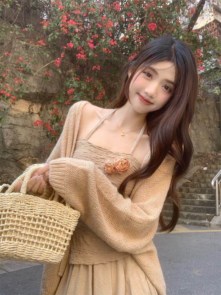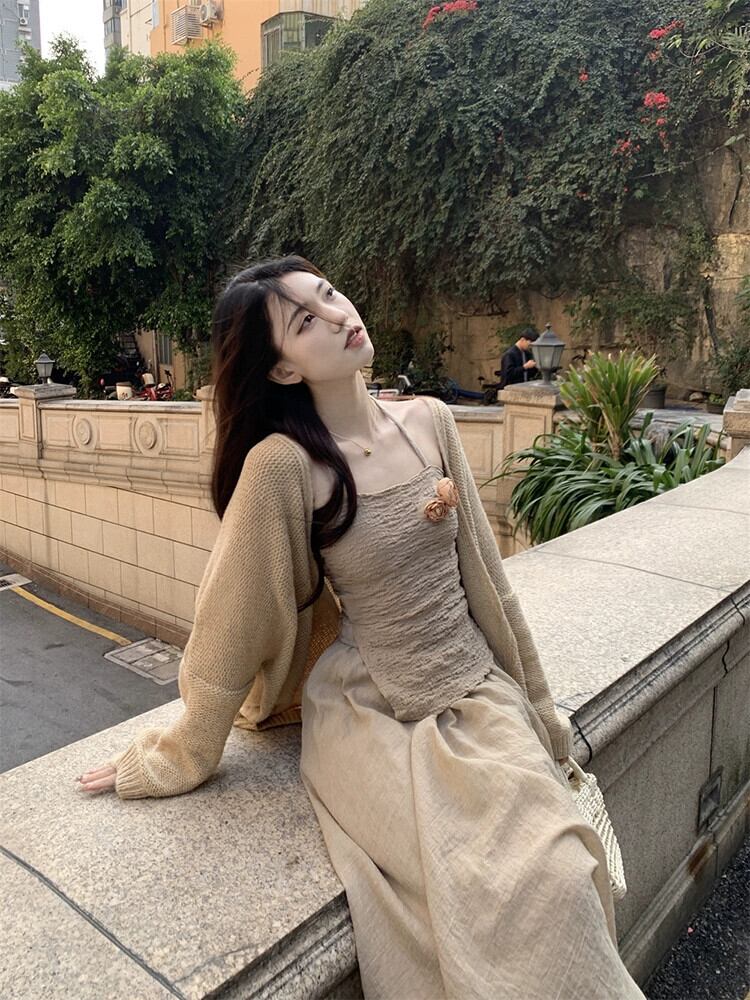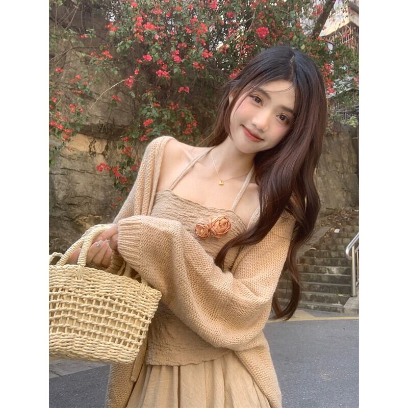 優しいスタイル不規則なホルターネックサスペンダーニットカーディガンミドル丈スカート女性 2023 夏の新作 3 点セット サマー 夏物 missk98338411354