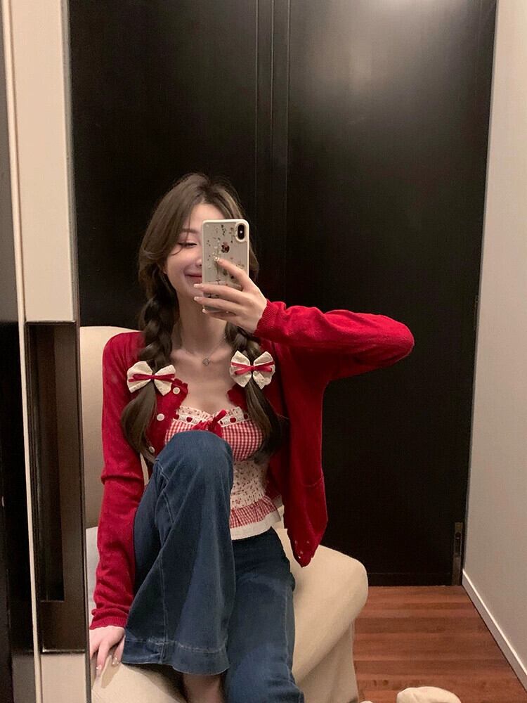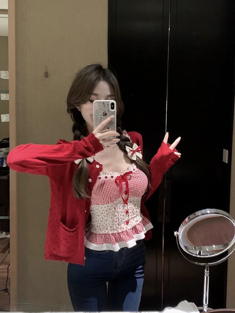 甘いネクタイスタイルチェック柄花サスペンダー長袖ニットカーディガン女性秋 2023 新しいファッションスーツ ロング 大人ガーリー スウィート キュート カジュアル オータム 秋物 花柄 missk17007223804