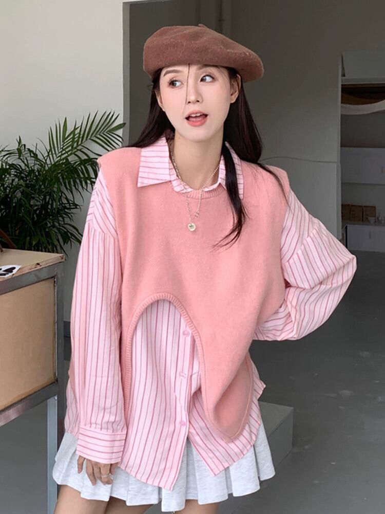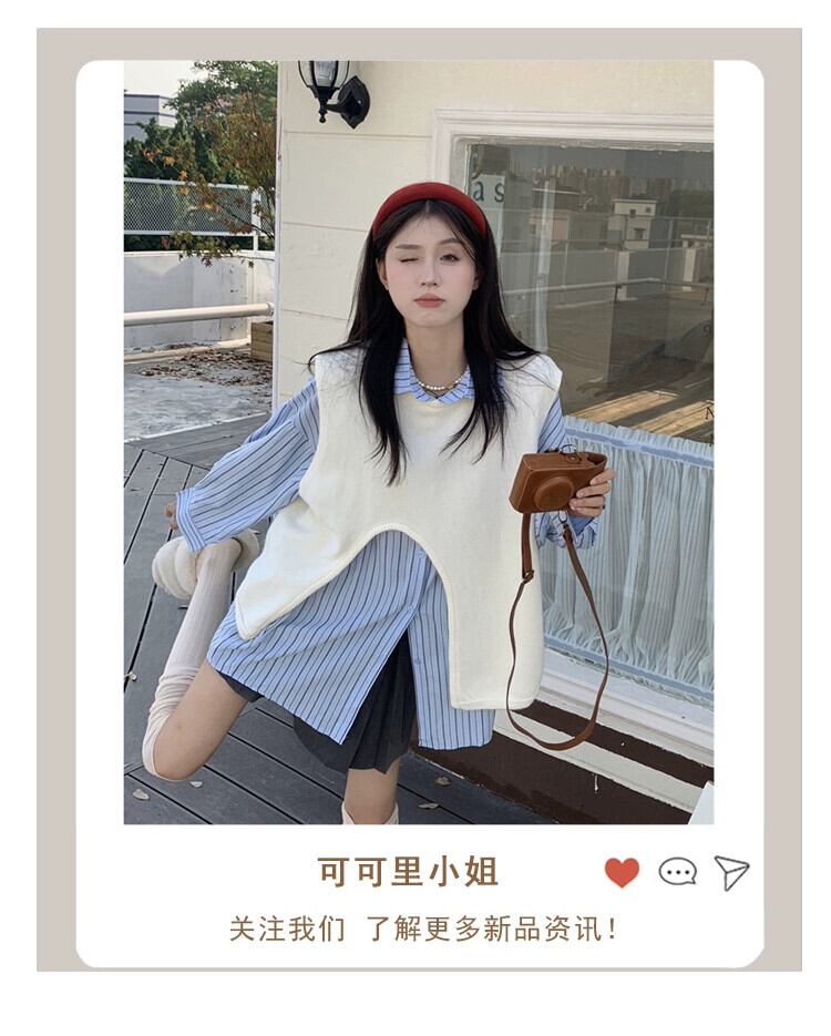 不規則なデザインのラウンドネックニットベスト + ストライプ長袖シャツの女性の秋 2023 新しいファッションスーツ ロング オータム 秋物 Oネック missk11255824382