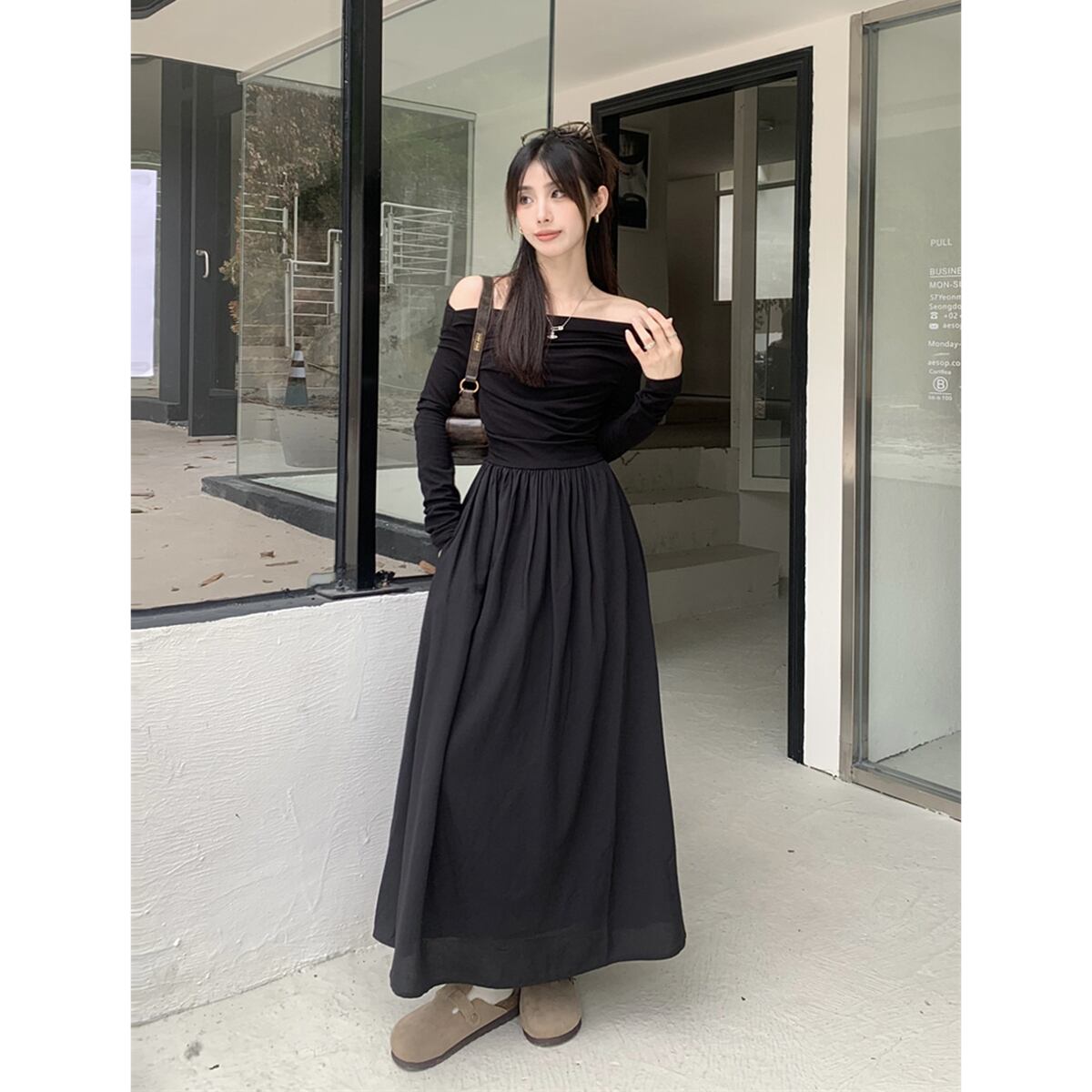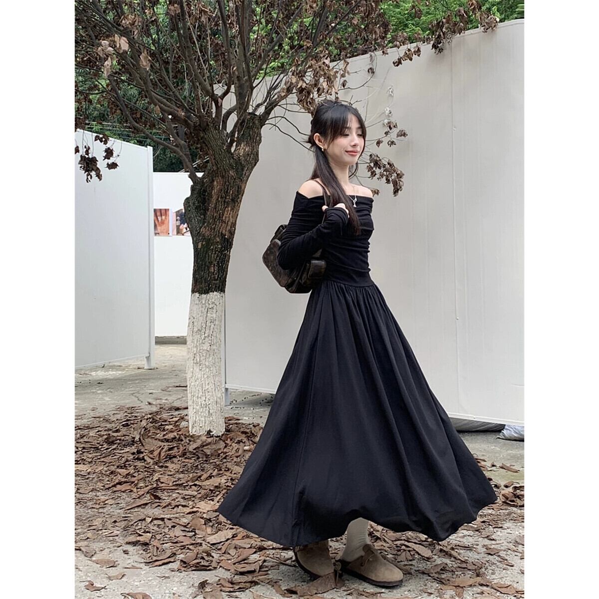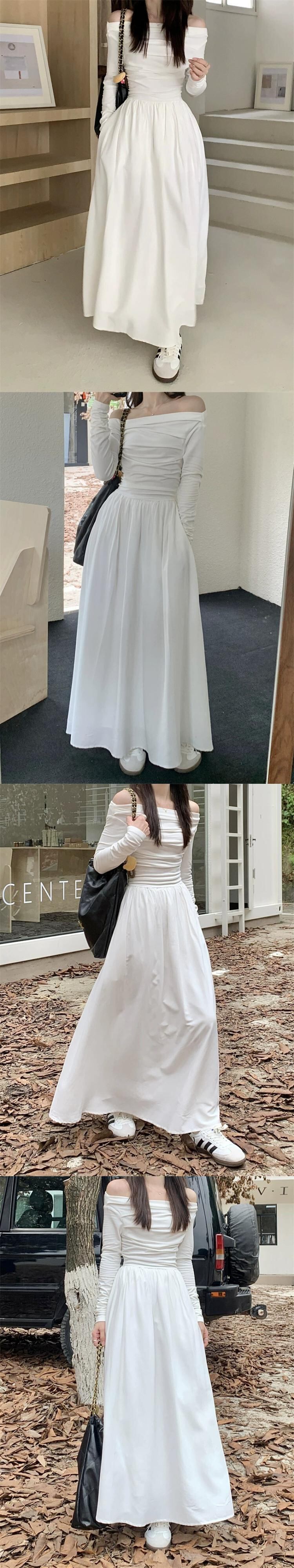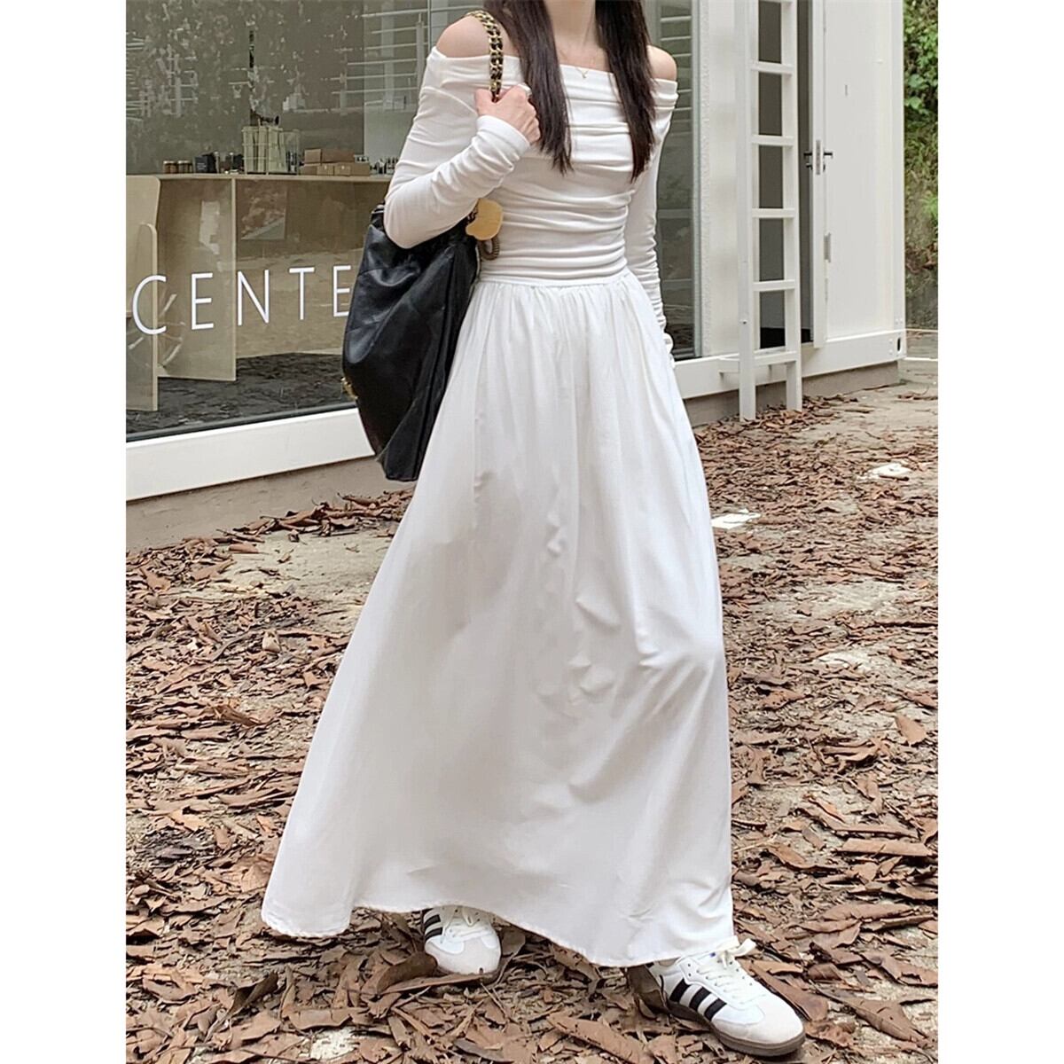 -終了オフショルダー白いドレス初秋2023新しいファッション気質ウエストAラインロングスカート婦人服 ホワイト オータム 秋物 missk63491635498
