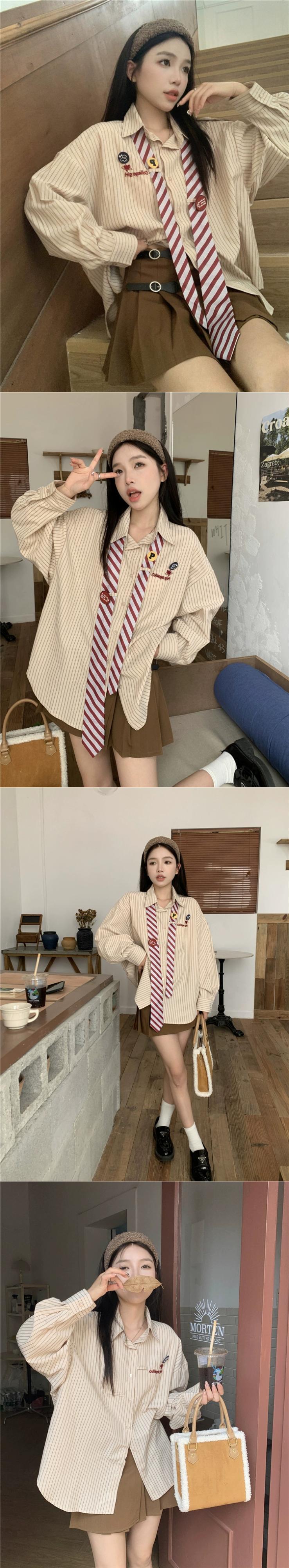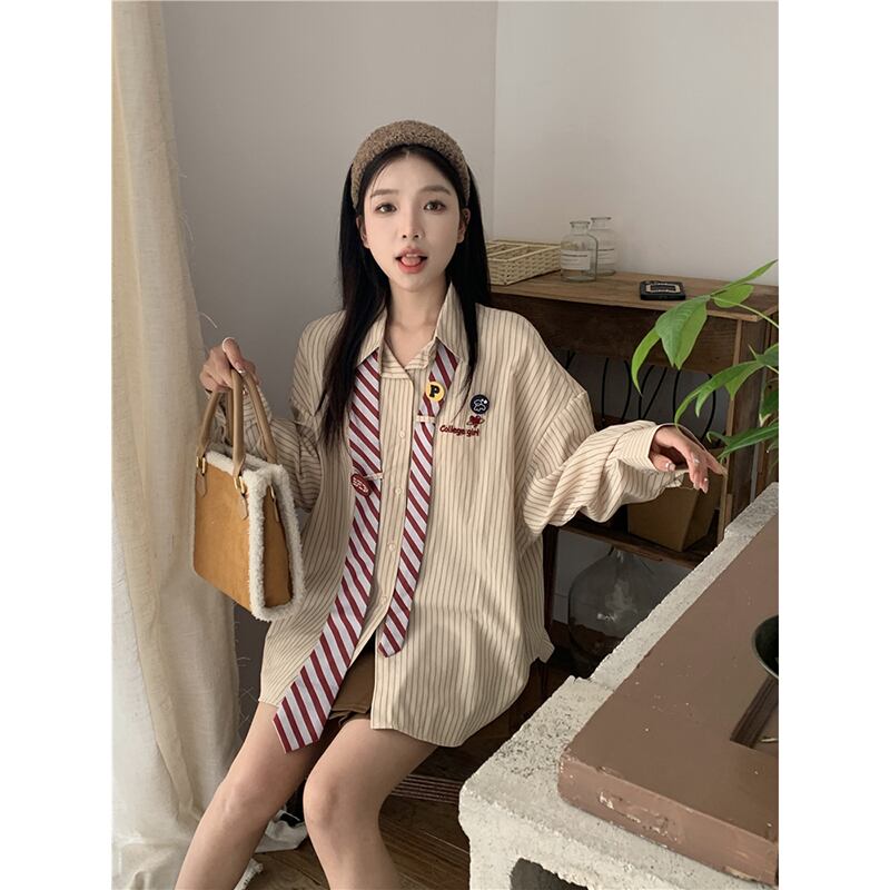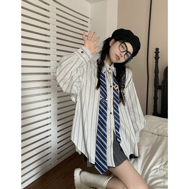 レトロストライプネクタイシャツ女性の夏 2023 ニッチルーズユニークシック長袖カーディガン ロング サマー 夏物 missk23000521410