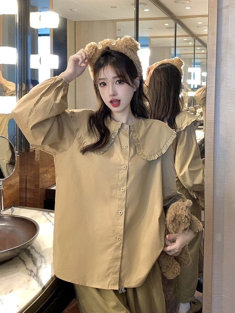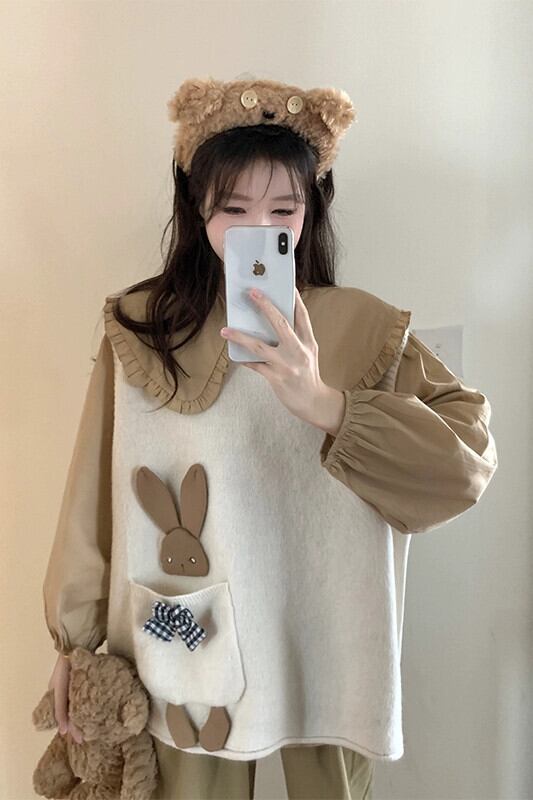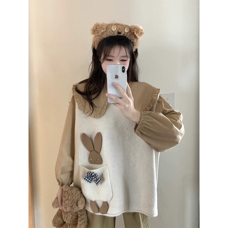 ベビードールの襟長袖シャツデザインかわいい年齢軽減レイヤードニットベスト女性秋 2023 新しい 2 点セット ロング レッド 大人ガーリー スウィート キュート カジュアル オータム 秋物 missk72464511748