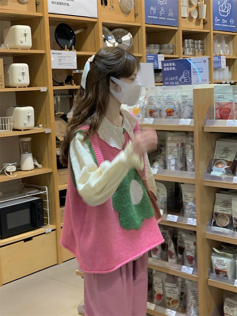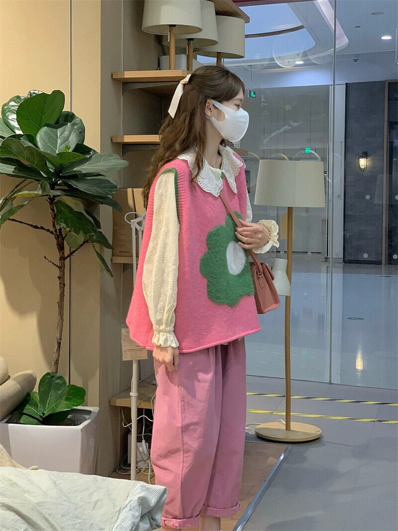 色:カーキフラワーベスト,ピンクの花のベスト,刺繍入りシャツ