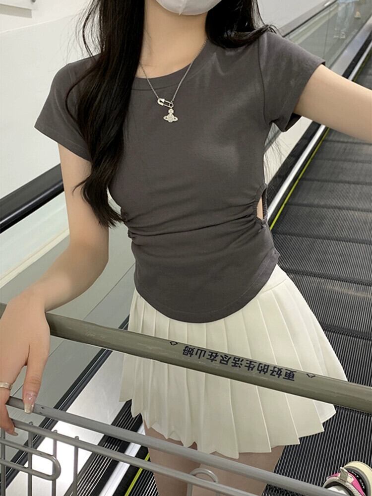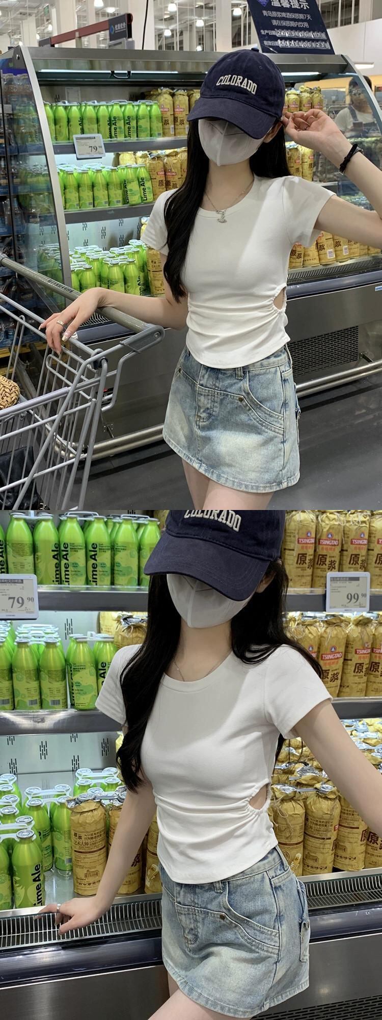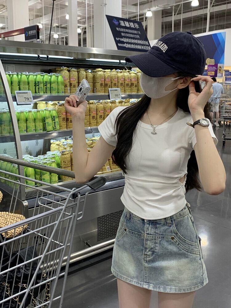 ホット中空ウエスト露出純綿半袖 T シャツ夏の新しいスタイル不規則なスリムフィットショートショルダートップ コットン サマー 夏物 Tシャツ ピュア missk59991554785
