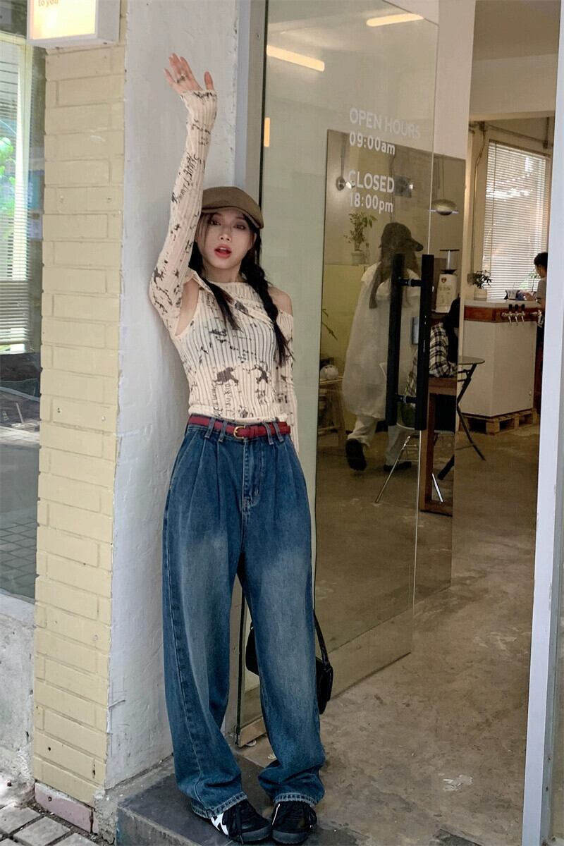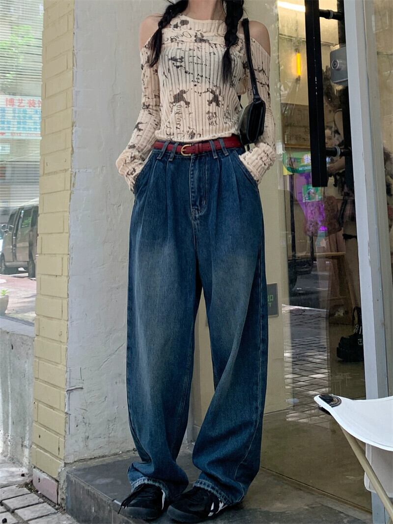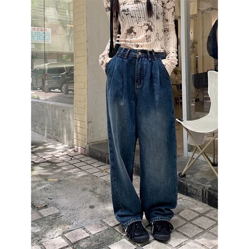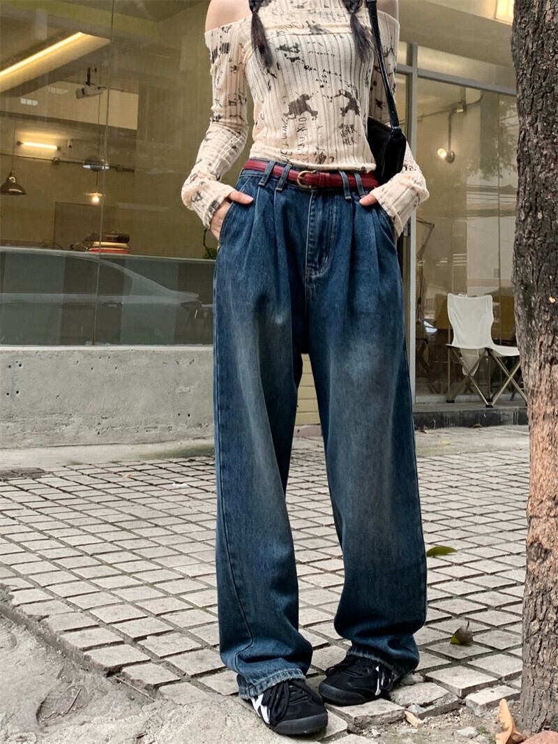 2023 秋の新スタイルファッショナブルなハイウエスト多用途スリムプリーツカジュアルストレートレッグフロアレングスワイドレッグジーンズ女性 オータム 秋物 missk25673835957