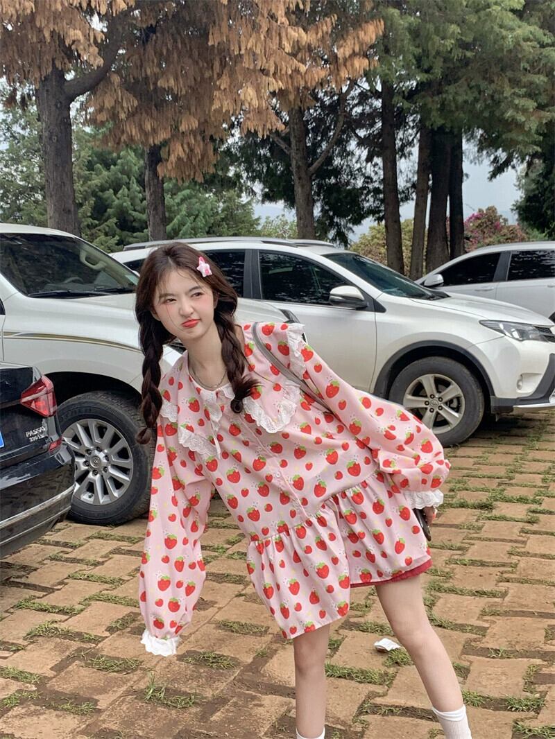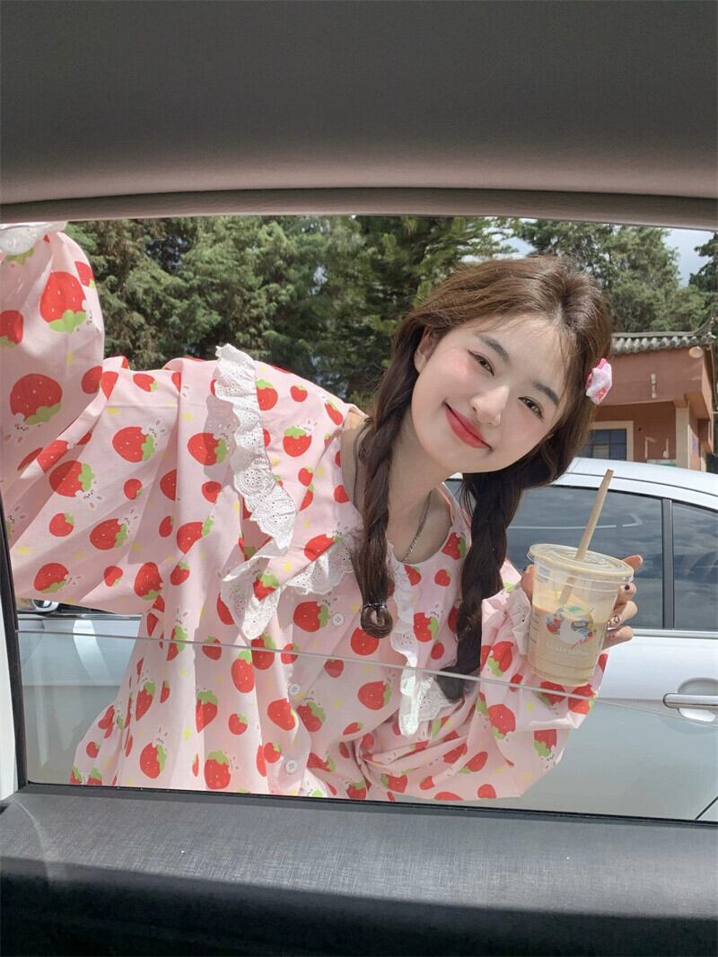 色:ピンクフローラルシャツ,ピンクのストロベリーシャツ
