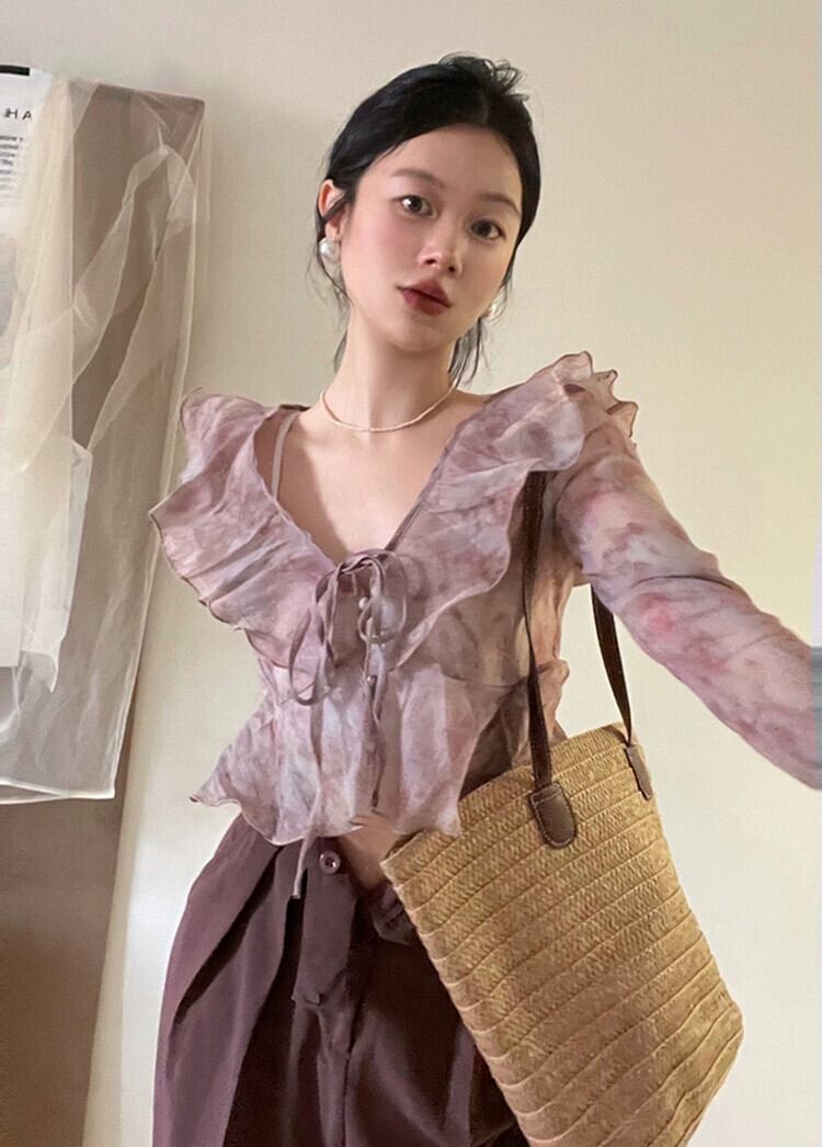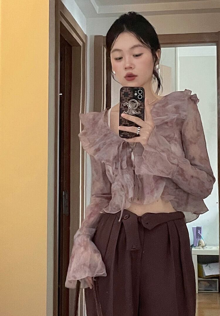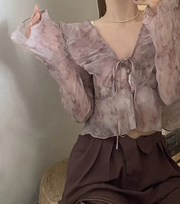 フリルレースアップ長袖シフォンシャツ女性の夏の 2023 新デザイン痩身ショート日焼け止めトップ ロング サマー 夏物 missk68902968082