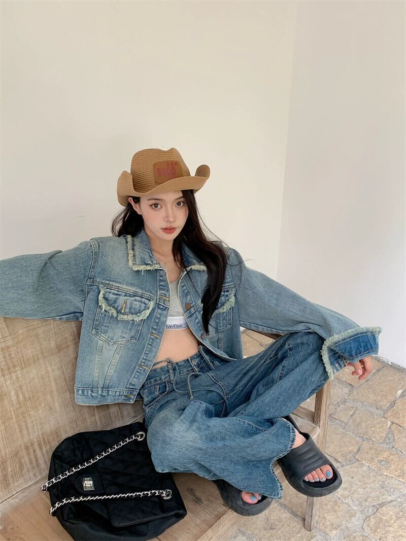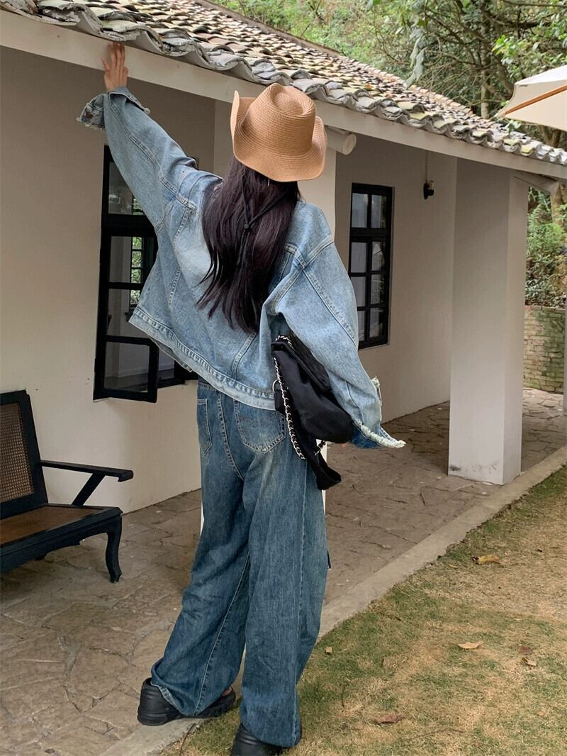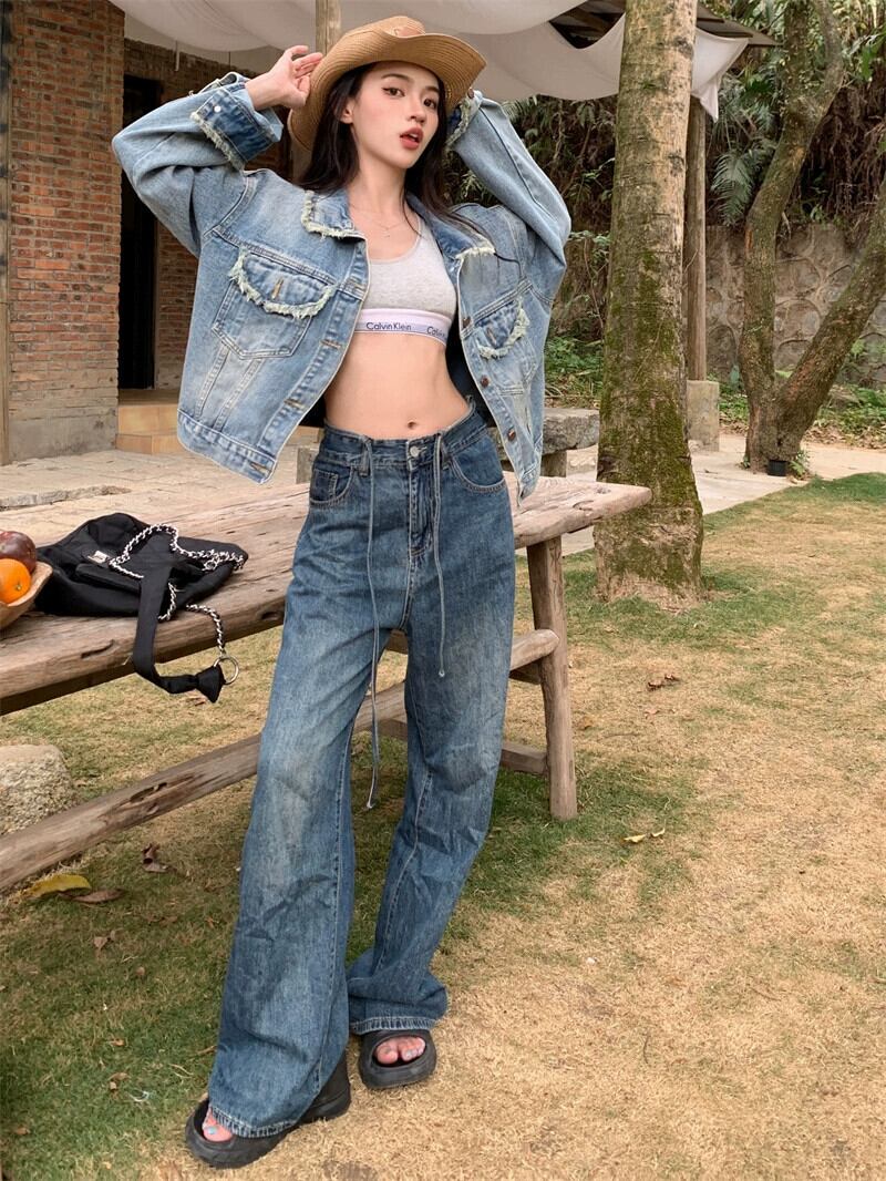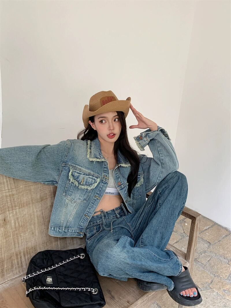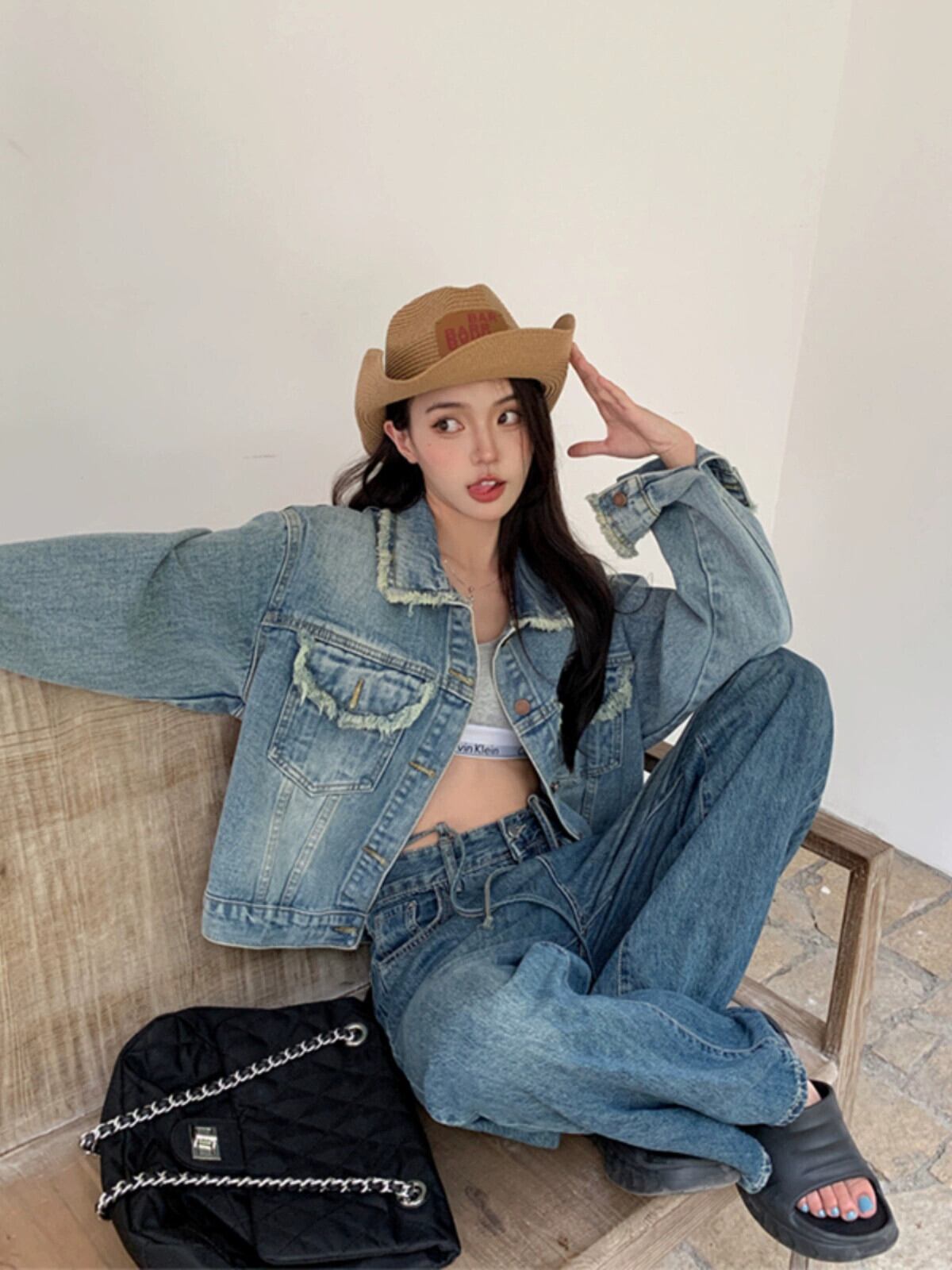 レトロなデニムジャケットの女性 2023 秋の新デザインのほつれ生端ルーズショート長袖トップ ロング オータム 秋物 missk30123450662