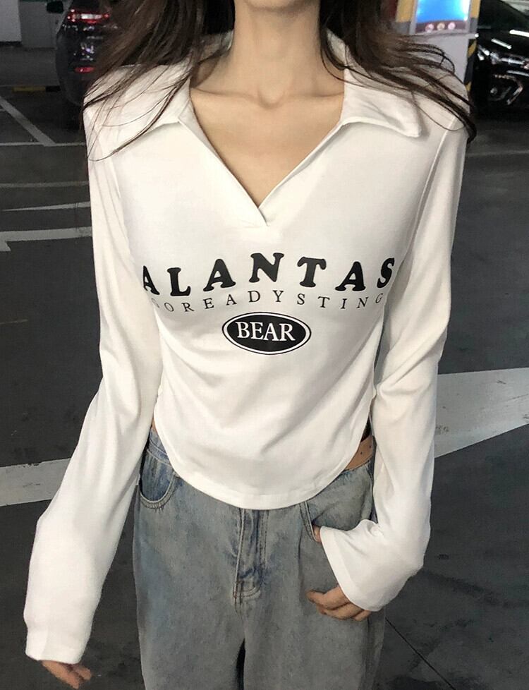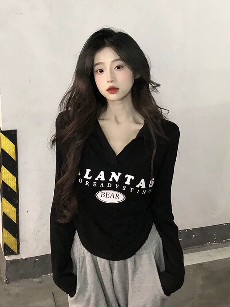 レタープリント小さなラペル長袖 Tシャツ夏バージョン 2023 新しいスリムフィット純粋な欲望ショートトップ女性 ロング サマー 夏物 ピュア missk78207573868