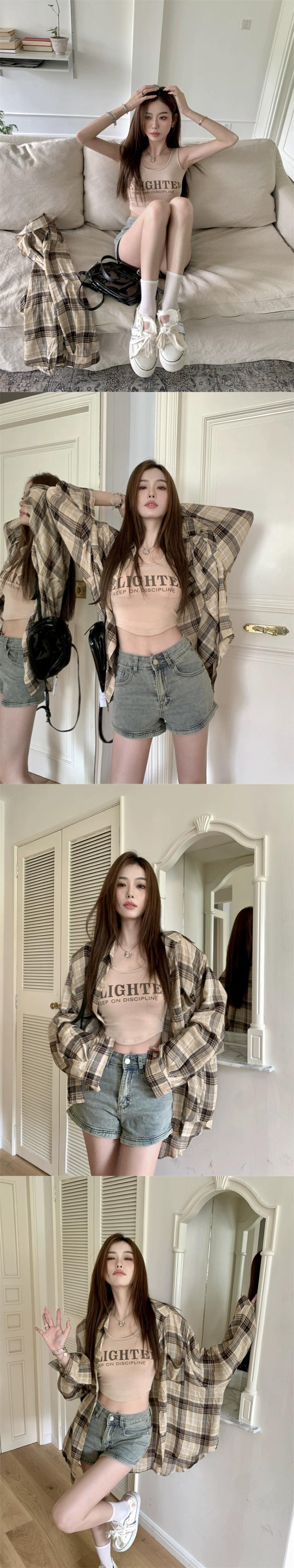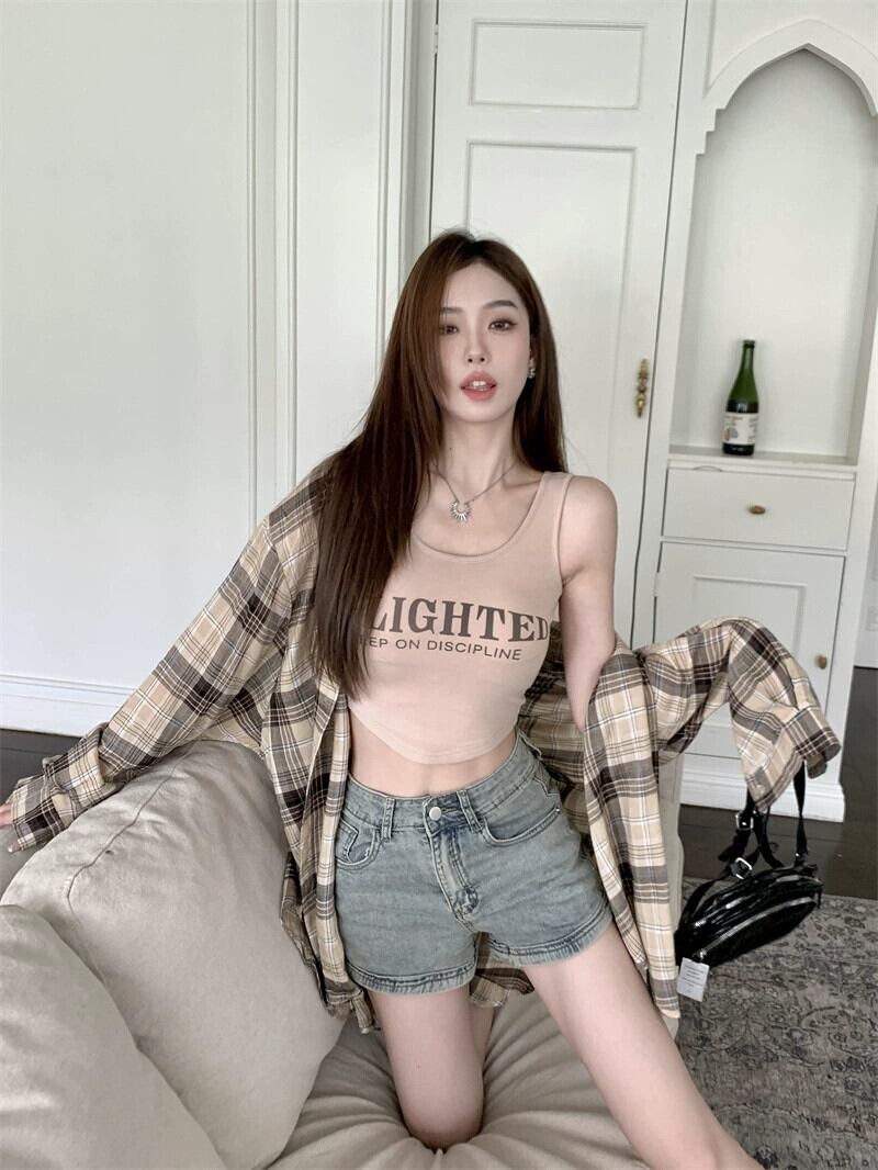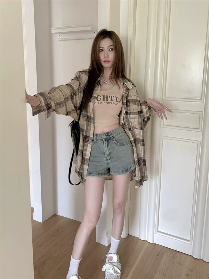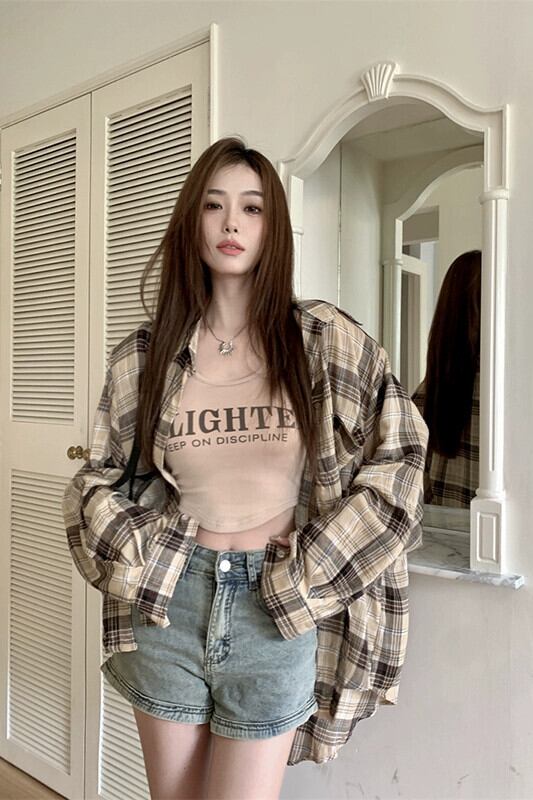 薄いチェック柄長袖日焼け止めシャツジャケット夏のインナーウェアレタリングへそベストサスペンダースーツレディースファッション ロング サマー 夏物 missk87477242317
