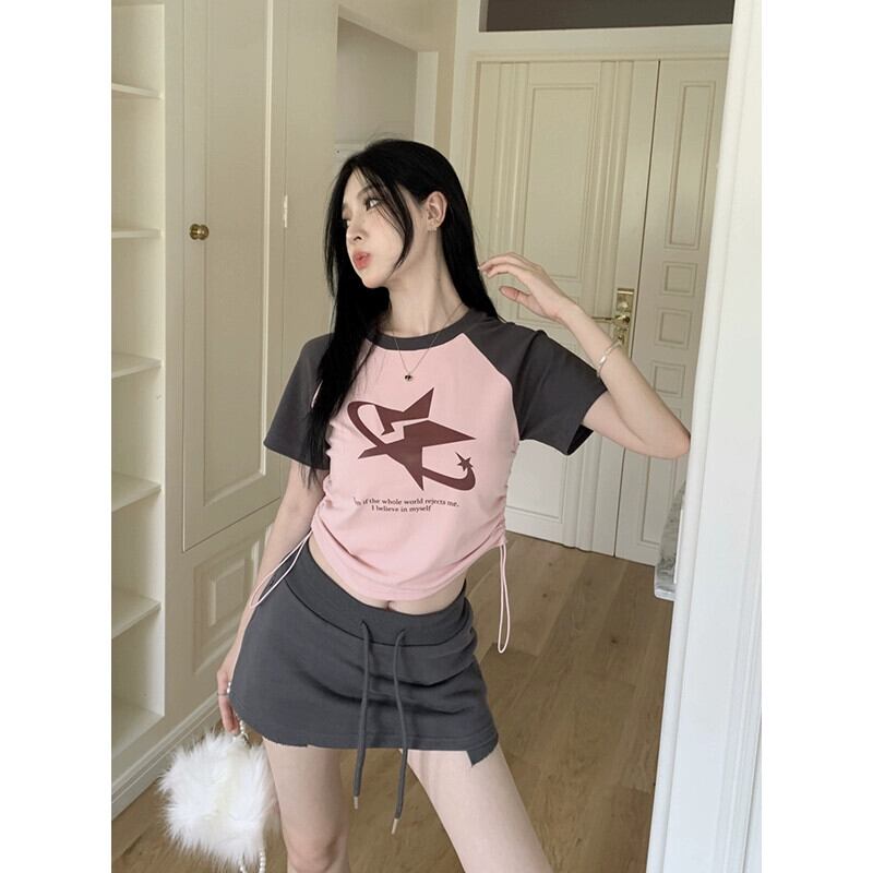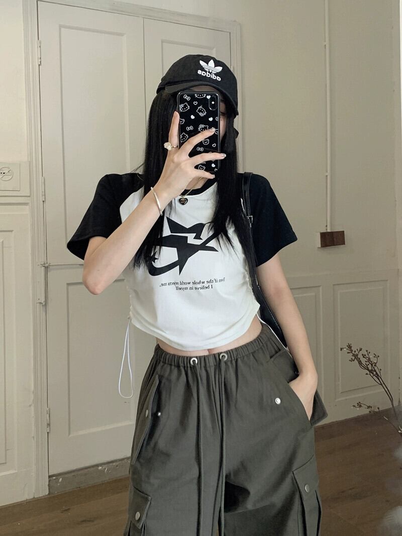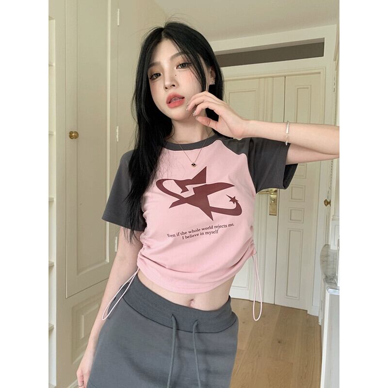 アメリカンホットガール巾着コントラストカラーショートTシャツ夏スリムフィットプリント半袖トップ女性 ハーフスリーブ サマー 夏物 missk21661236702