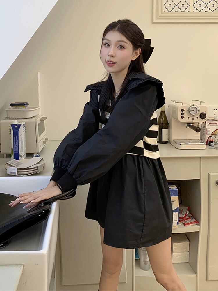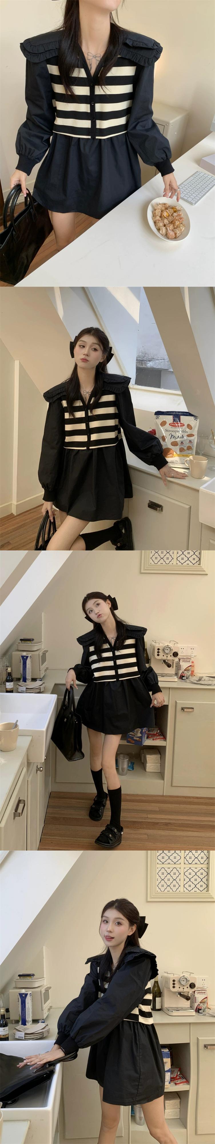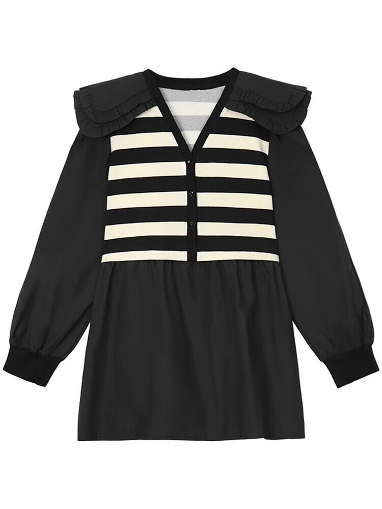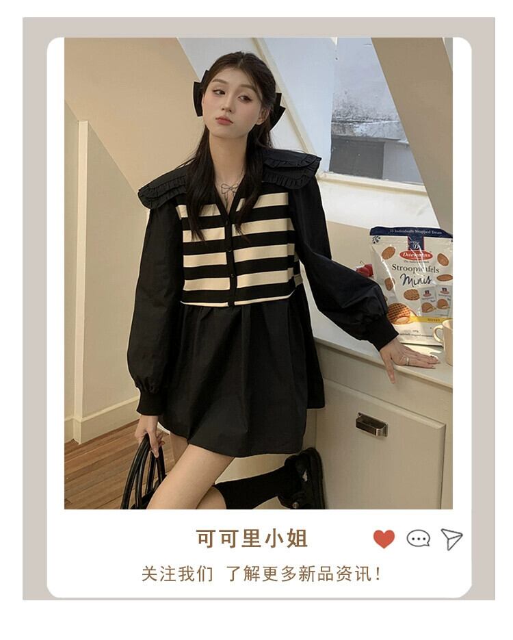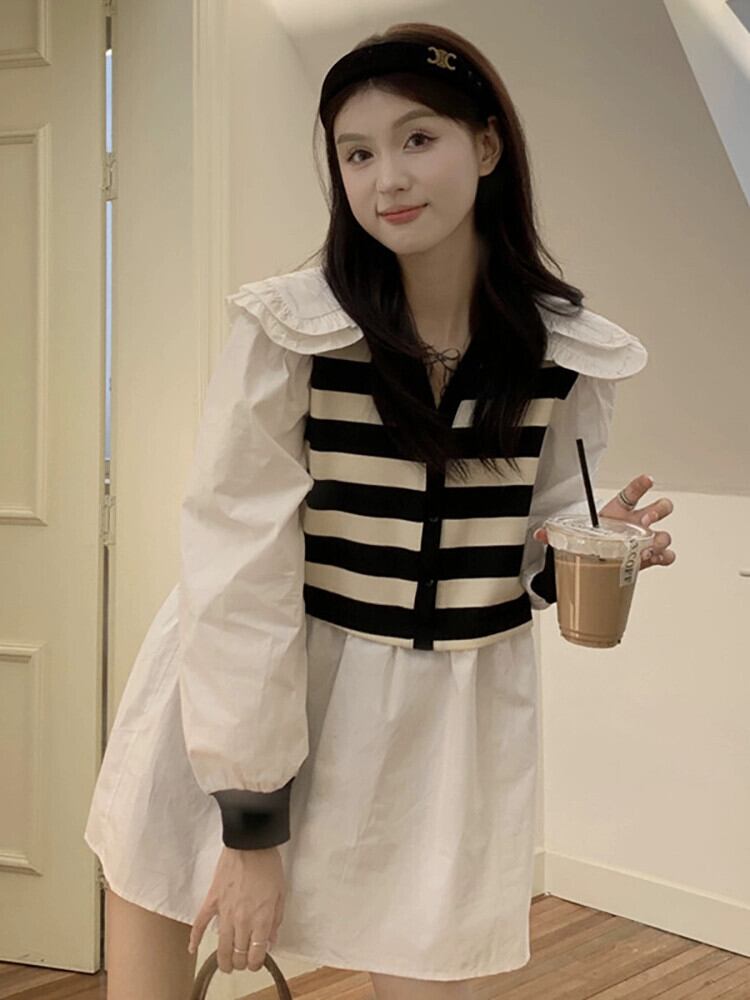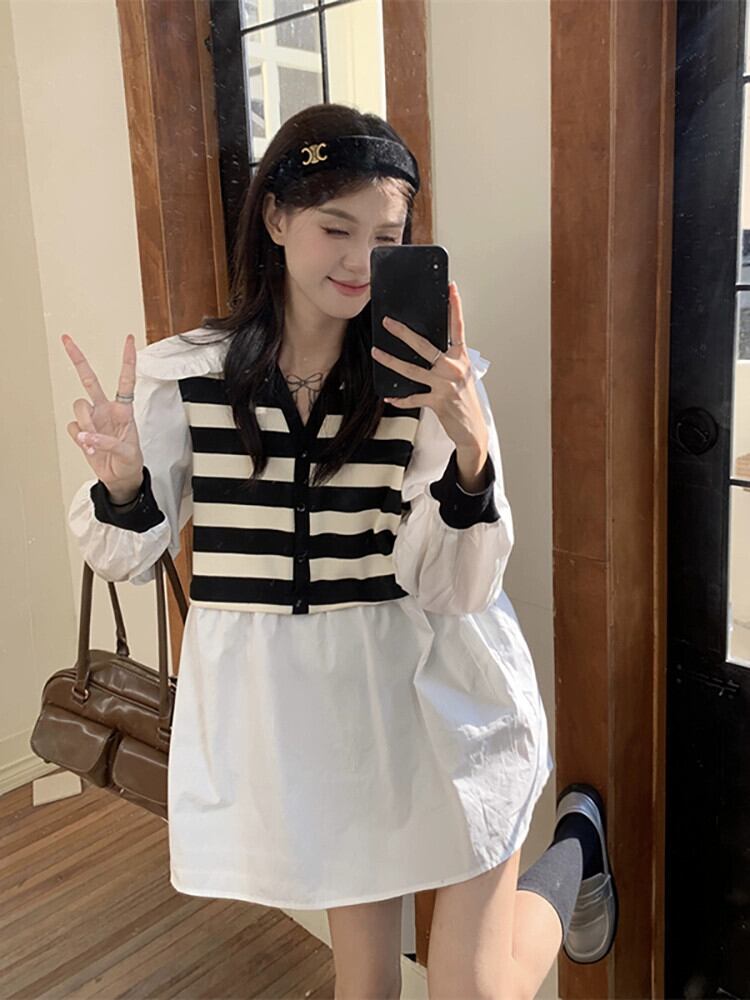 二重層人形襟ステッチストライプ長袖シャツ女性の夏の 2023 新しいスタイルフレンチレトロフェイクツーピーストップ ロング サマー 夏物 missk31884639551