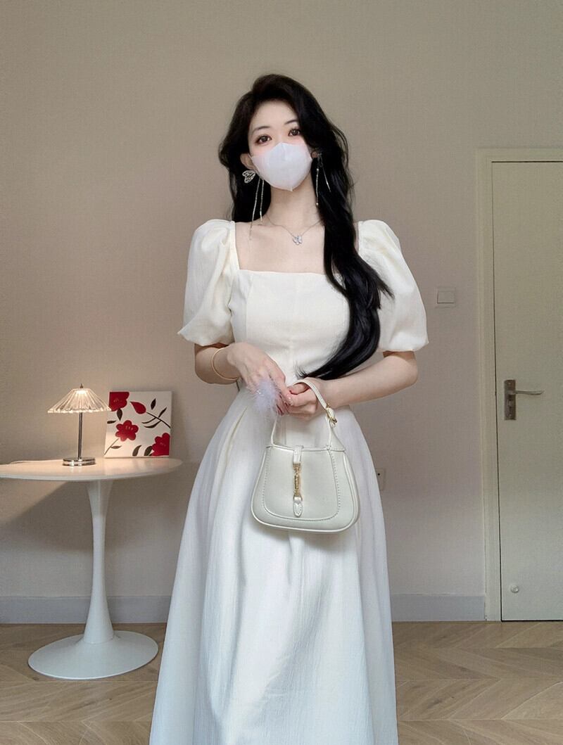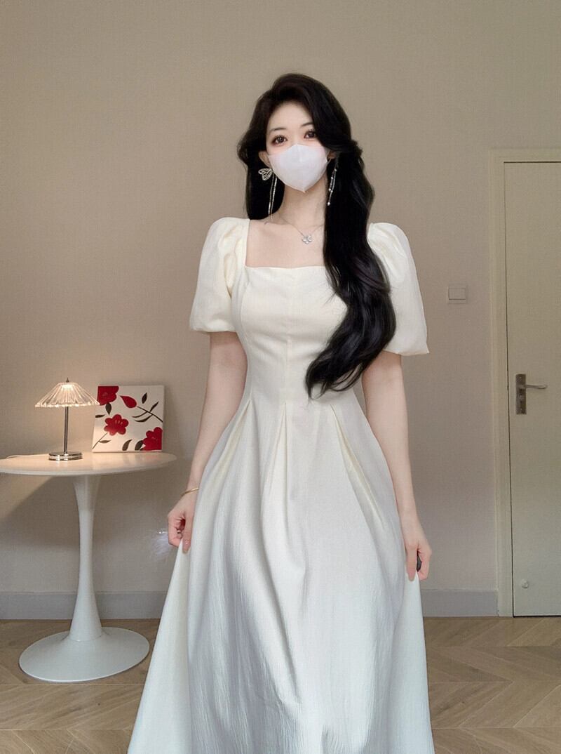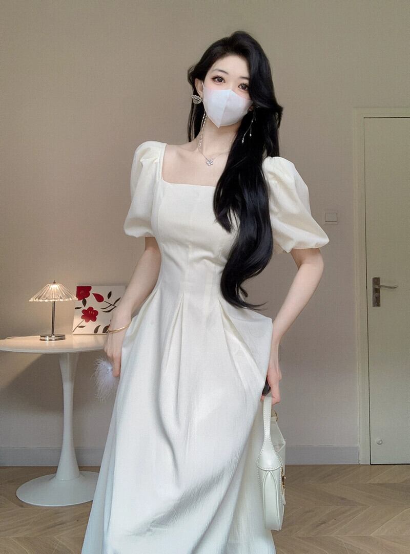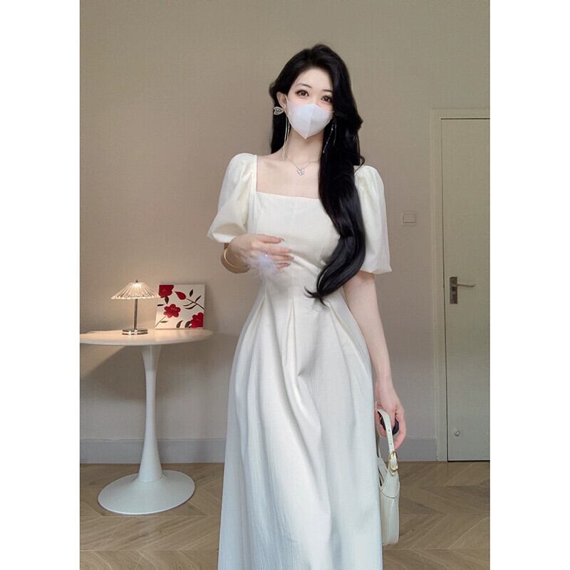 フレンチライト大人スタイルパフスリーブドレス夏 2023 新しいスクエアカラー気質ウエスト優しいティーブレイクロングスカート女性 サマー 夏物 スクウェア missk79655944251
