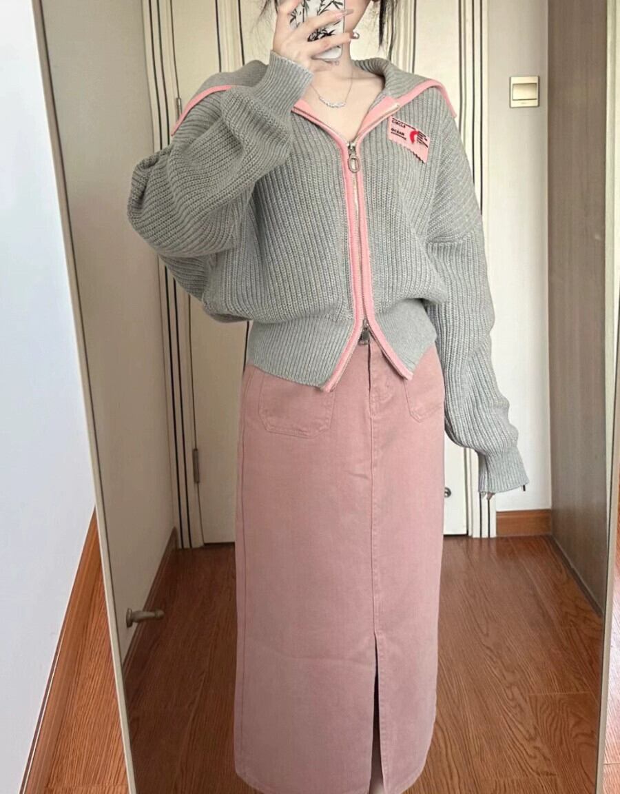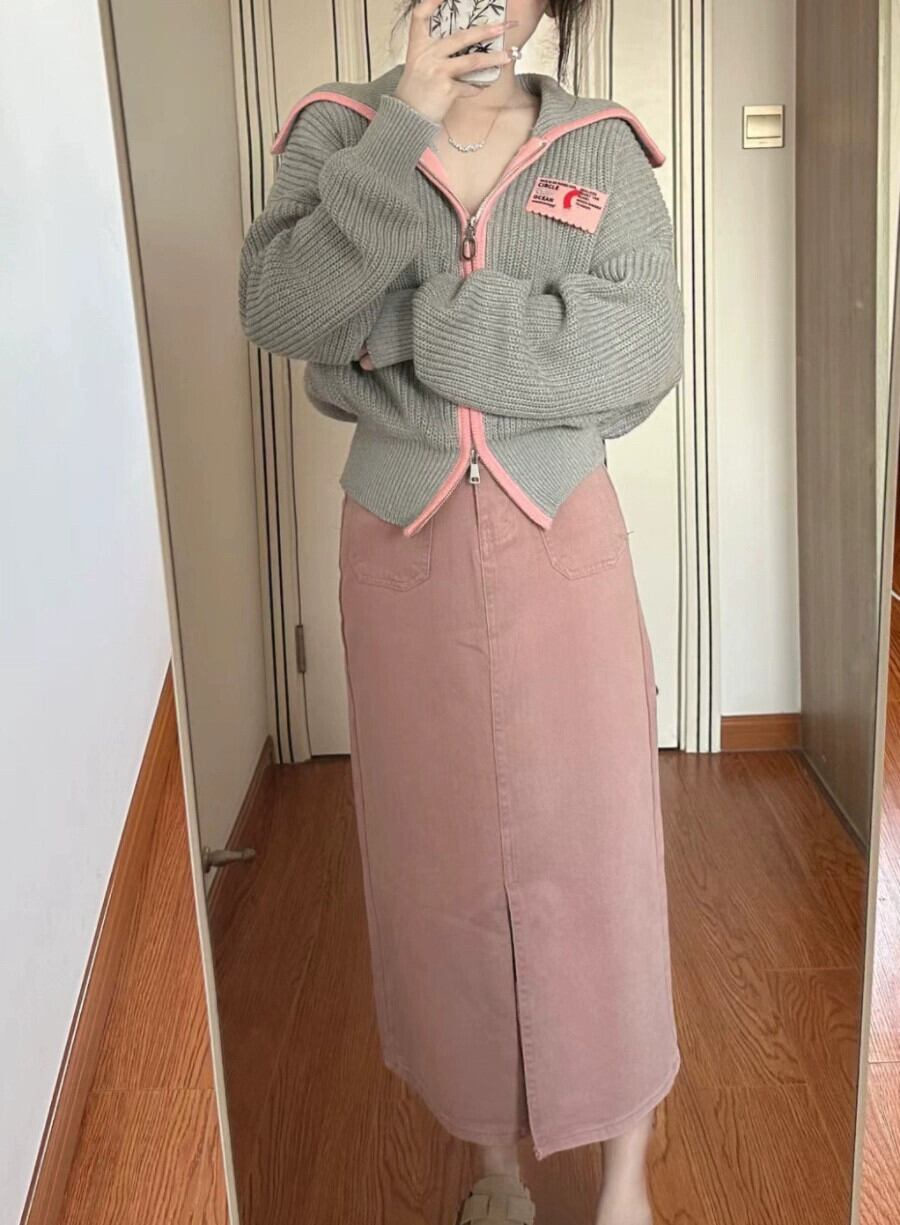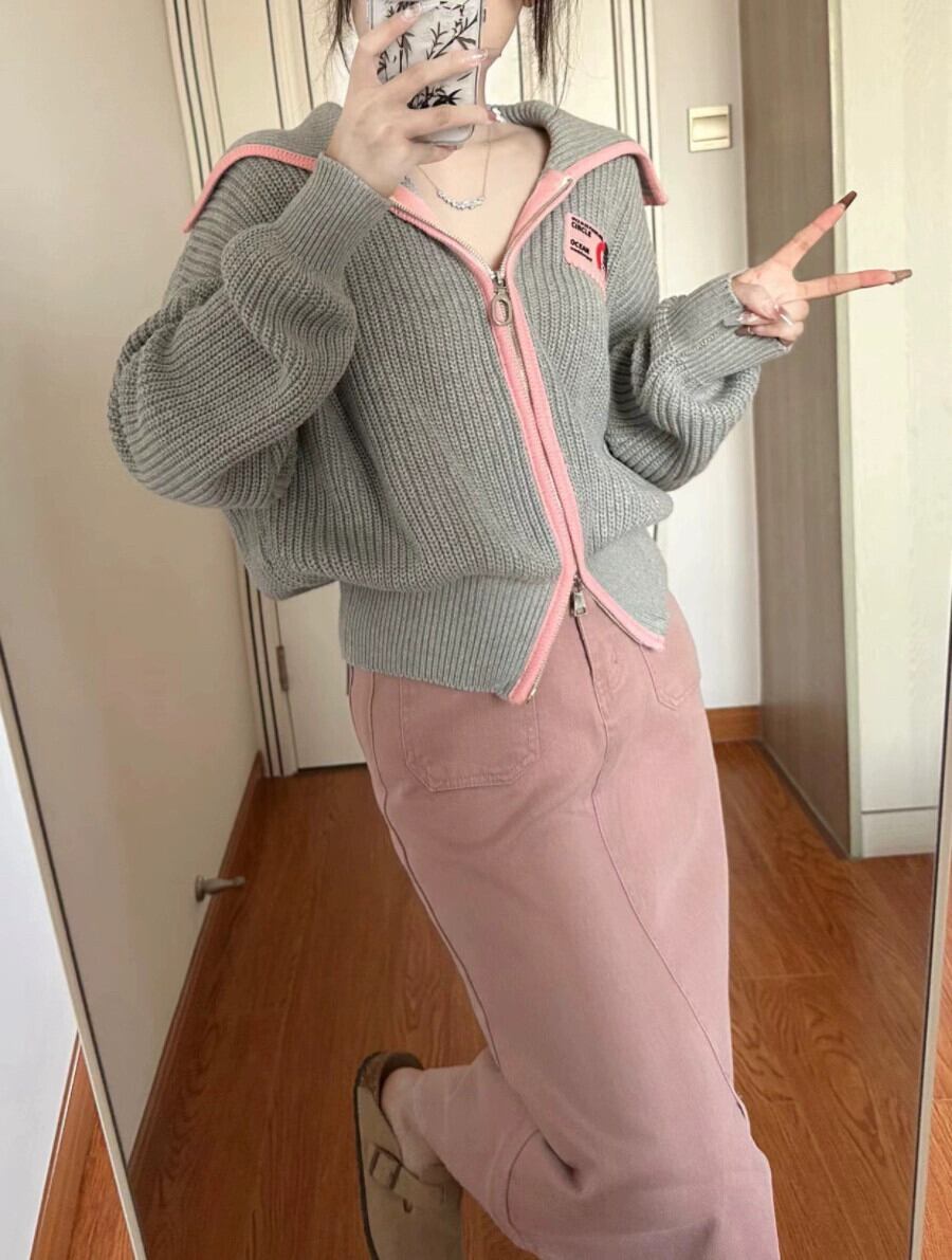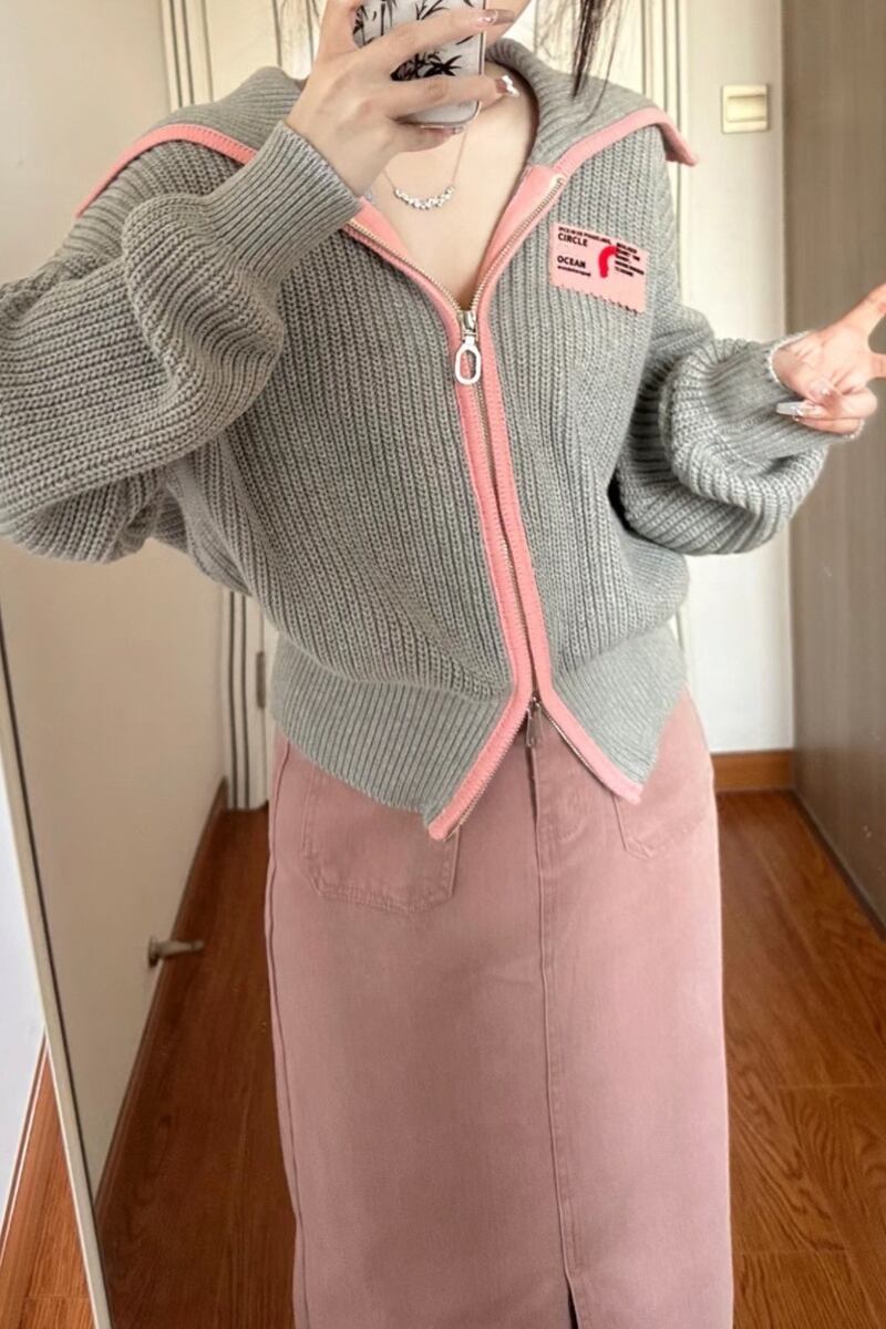 ラペルジッパー長袖セーターの女性の秋スタイル 2023 新しいスタイル怠惰なスタイルのカラーブロッキングデザインニットジャケット ロング オータム 秋物 missk12637931899