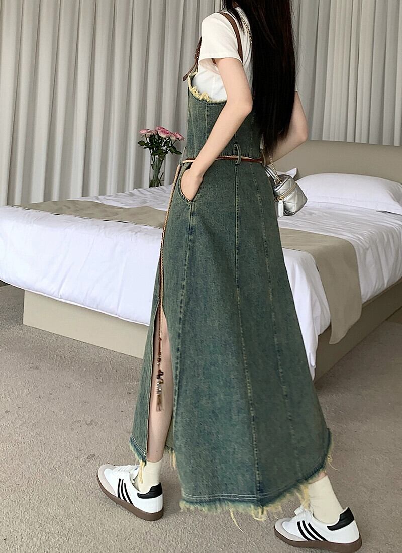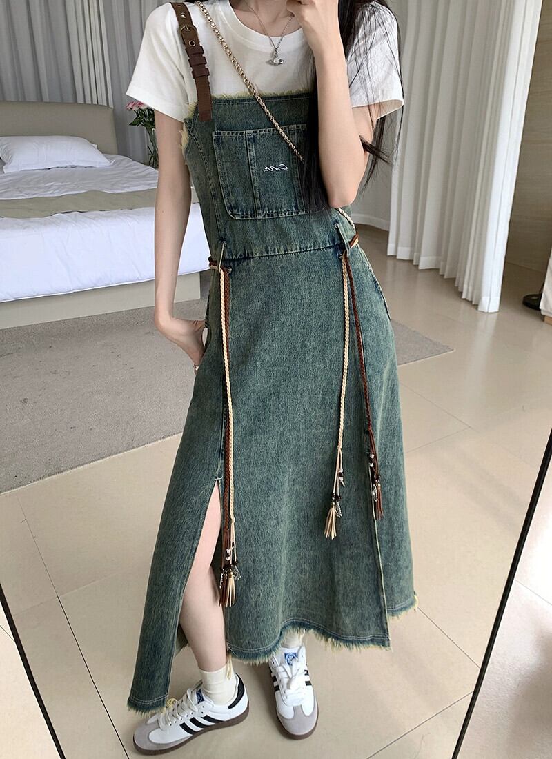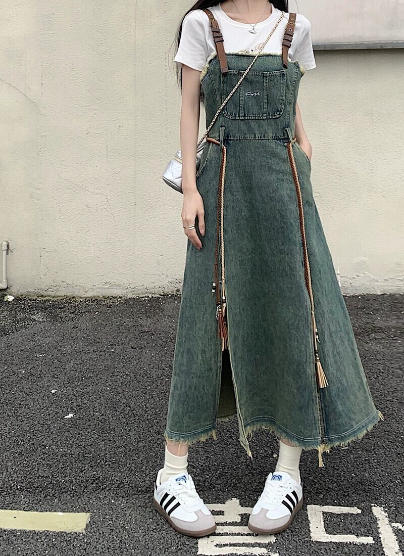 レトロテルデニムサスペンダードレス女性の夏の新しいスタイルのウエストデザインスリット気質ミッドレングススカート サマー 夏物 missk35716914835