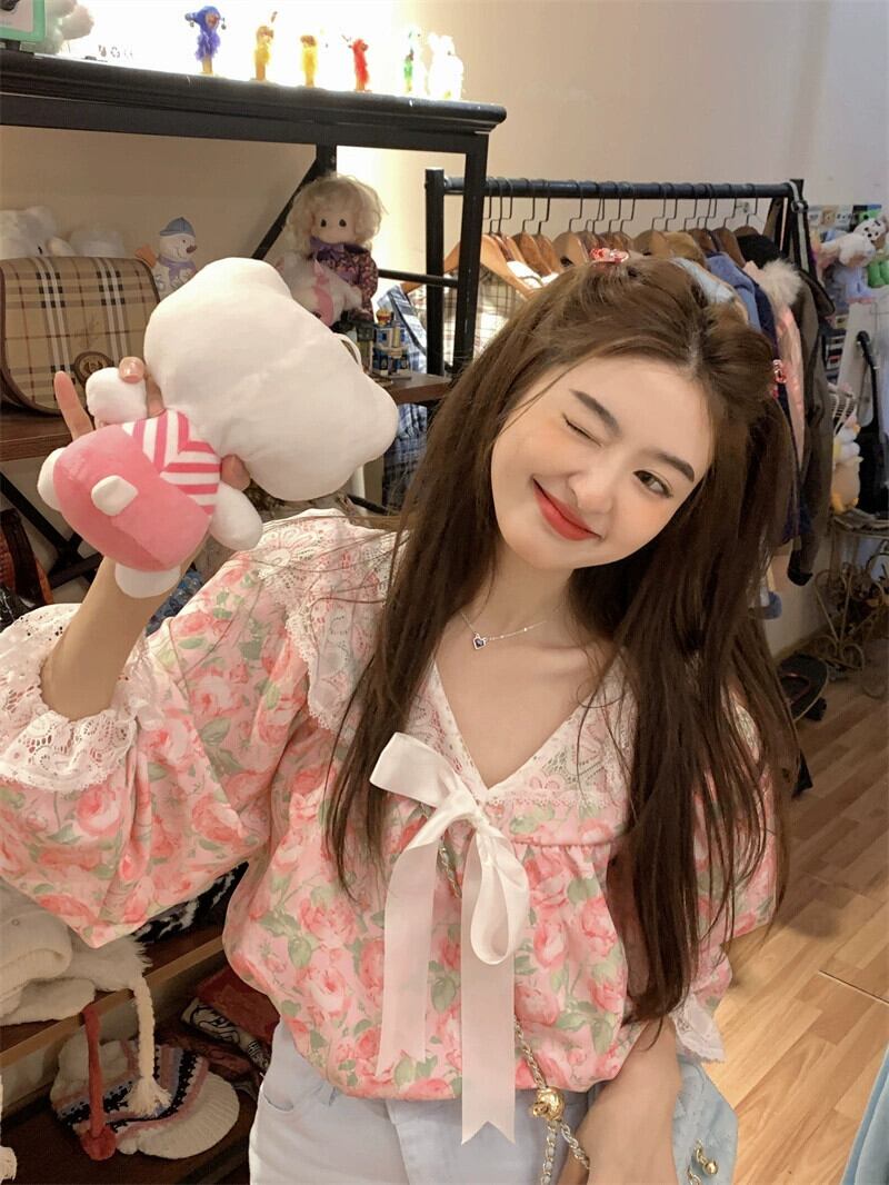 Sweet y ネクタイボウシャツ夏 2023 新しいスリムフィット eign スタイルレースステッチ V ネックトップ リボン 大人ガーリー スウィート キュート カジュアル サマー 夏物 Vネック missk40056644401
