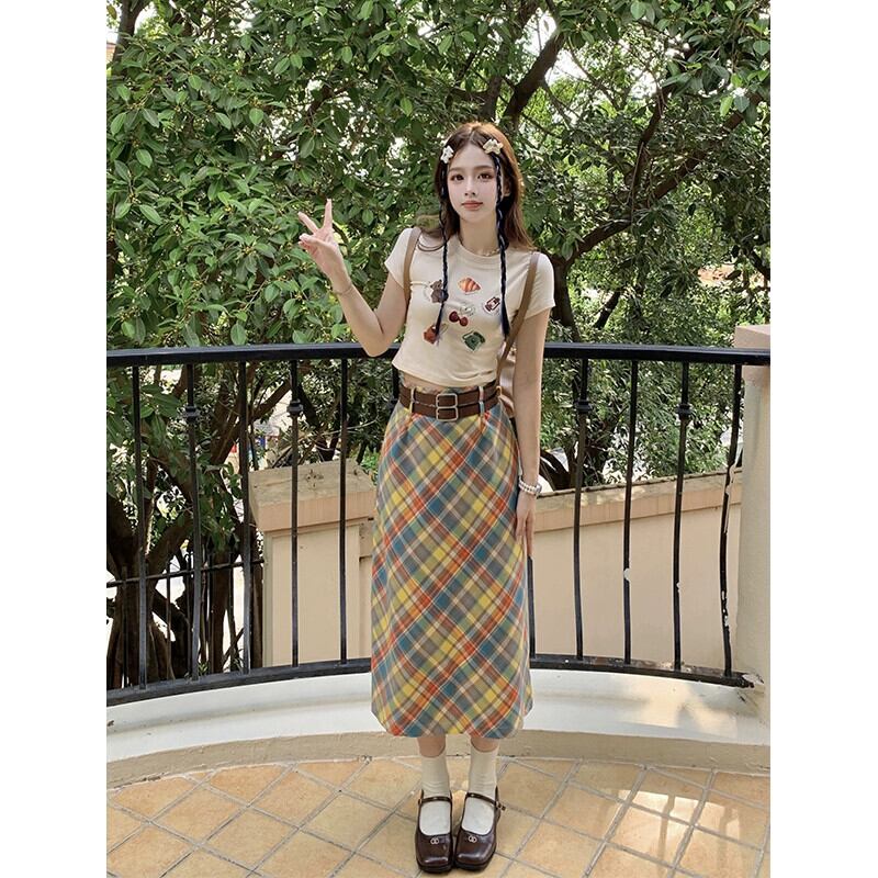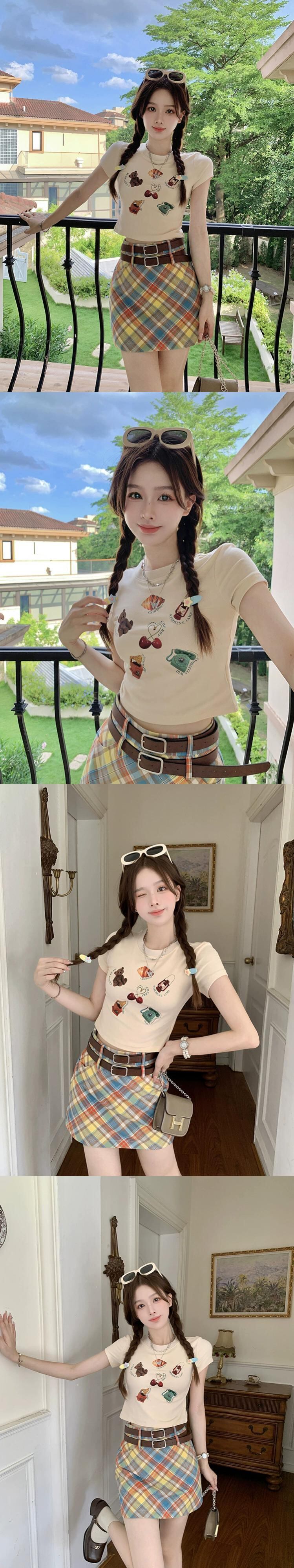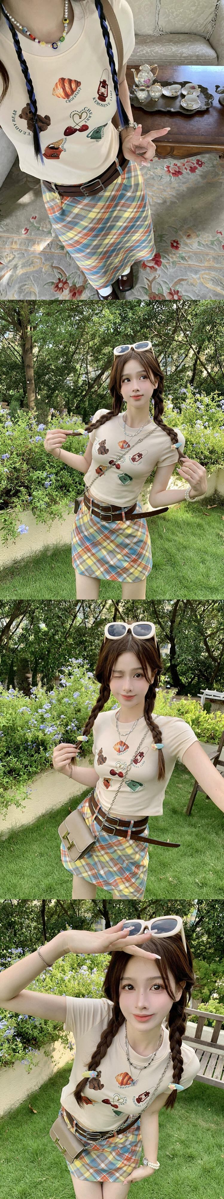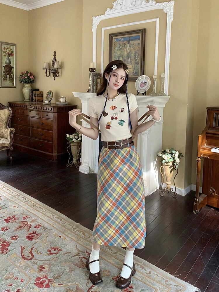 ドーパミンは、夏のカラフルなチェック柄のハイウエスト スカートとシックなプリントの半袖 T シャツの完全なセットを着ています サマー 夏物 Tシャツ missk95206361321