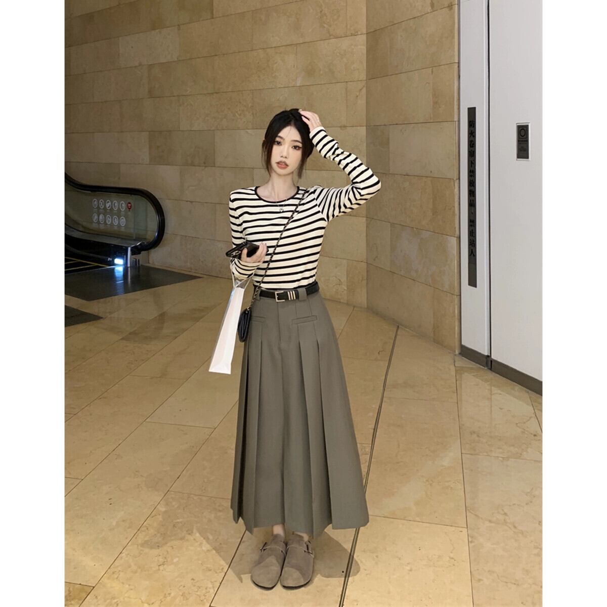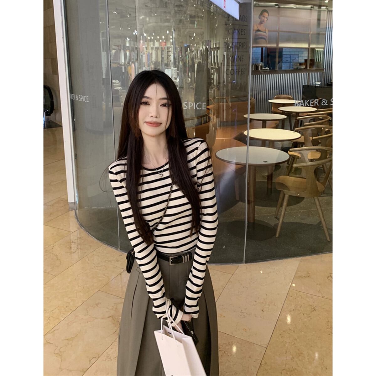 シックなストライプ長袖 T シャツの女性の秋バージョン 2023 新しいスリムフィットイン超多目的ラウンドネックトップ ロング オータム 秋物 Oネック Tシャツ missk74331832345