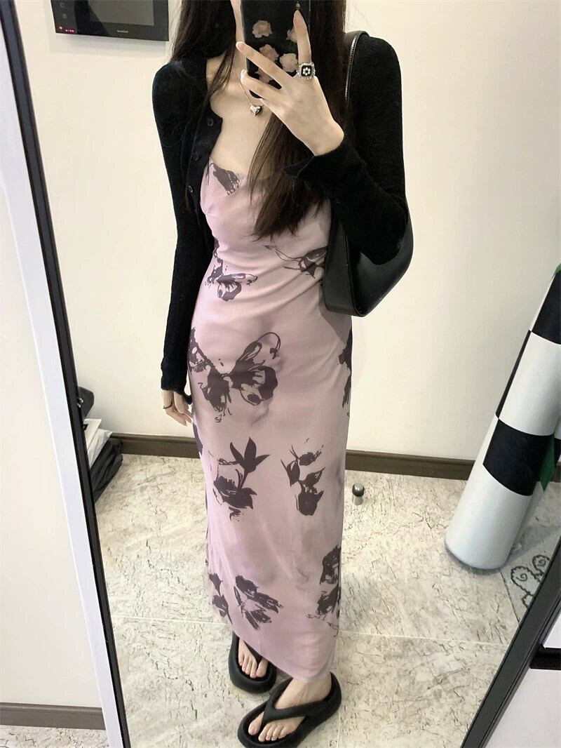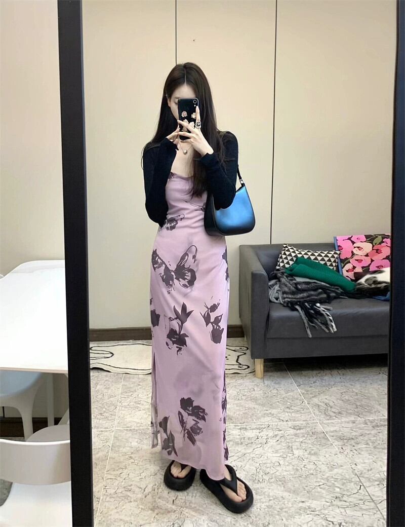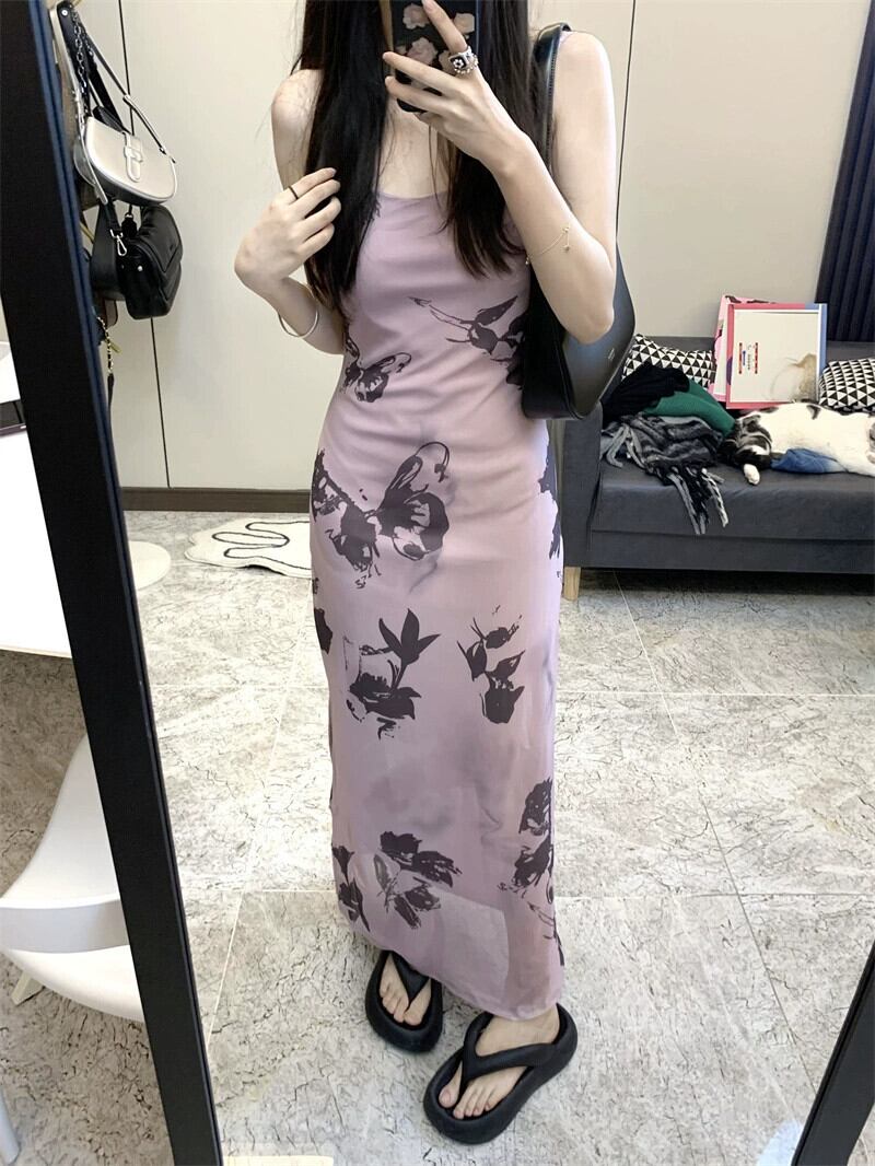 蝶絞り染めパープルメッシュサスペンダードレス女性の夏の新しいフレンチウエスト痩身ロングスカートシック サマー 夏物 missk28435555938